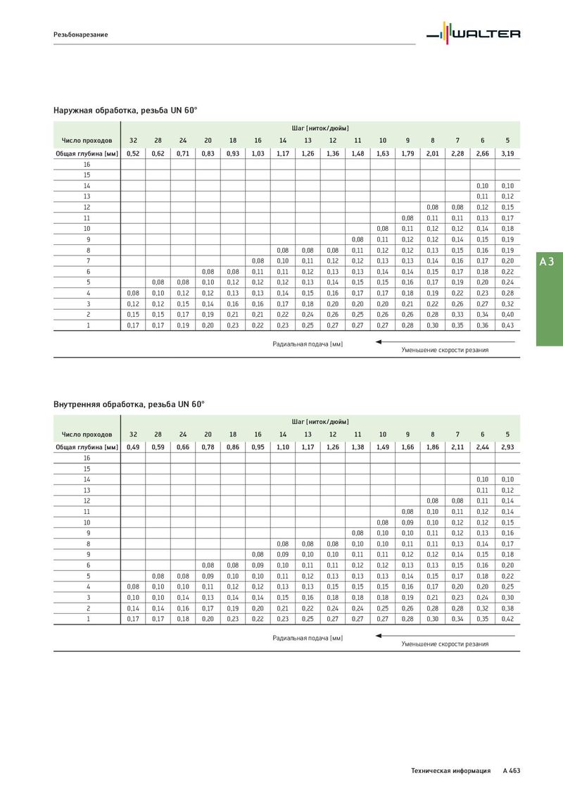 Резьбонарезание Наружная обработка, резьба UN 60° Шаг [ниток/дюйм] Число проходов 32 28 24 20 18 16 14 13 12 11 10 9 8 7 6 5 Общая глубина [мм] 0,52 0,62 0,71 0,83 0,93 1,03 1,17 1,26 1,36 1,48 1,63 1,79 2,01 2,28 2,66 3,19 16 15 14 0,10 0,10 13 0,11 0,12 12 0,08 0,08 0,12 0,15 11 0,08 0,11 0,11 0,13 0,17 10 0,08 0,11 0,12 0,12 0,14 0,18 9 0,08 0,11 0,12 0,12 0,14 0,15 0,19 8 0,08 0,08 0,08 0,11 0,12 0,12 0,13 0,15 0,16 0,19 7 0,08 0,10 0,11 0,12 0,12 0,13 0,13 0,14 0,16 0,17 0,20 A3 6 0,08 0,08 0,11 0,11 0,12 0,13 0,13 0,14 0,14 0,15 0,17 0,18 0,22 5 0,08 0,08 0,10 0,12 0,12 0,12 0,13 0,14 0,15 0,15 0,16 0,17 0,19 0,20 0,24 4 0,08 0,10 0,12 0,12 0,13 0,13 0,14 0,15 0,16 0,17 0,17 0,18 0,19 0,22 0,23 0,28 3 0,12 0,12 0,15 0,14 0,16 0,16 0,17 0,18 0,20 0,20 0,20 0,21 0,22 0,26 0,27 0,32 2 0,15 0,15 0,17 0,19 0,21 0,21 0,22 0,24 0,26 0,25 0,26 0,26 0,28 0,33 0,34 0,40 1 0,17 0,17 0,19 0,20 0,23 0,22 0,23 0,25 0,27 0,27 0,27 0,28 0,30 0,35 0,36 0,43 Радиальная подача [мм] Уменьшение скорости резания Внутренняя обработка, резьба UN 60° Шаг [ниток/дюйм] Число проходов 32 28 24 20 18 16 14 13 12 11 10 9 8 7 6 5 Общая глубина [мм] 0,49 0,59 0,66 0,78 0,86 0,95 1,10 1,17 1,26 1,38 1,49 1,66 1,86 2,11 2,44 2,93 16 15 14 0,10 0,10 13 0,11 0,12 12 0,08 0,08 0,11 0,14 11 0,08 0,10 0,11 0,12 0,14 10 0,08 0,09 0,10 0,12 0,12 0,15 9 0,08 0,10 0,10 0,11 0,12 0,13 0,16 8 0,08 0,08 0,08 0,10 0,10 0,11 0,11 0,13 0,14 0,17 9 0,08 0,09 0,10 0,10 0,11 0,11 0,12 0,12 0,14 0,15 0,18 6 0,08 0,08 0,09 0,10 0,11 0,11 0,12 0,12 0,13 0,13 0,15 0,16 0,20 5 0,08 0,08 0,09 0,10 0,10 0,11 0,12 0,13 0,13 0,13 0,14 0,15 0,17 0,18 0,22 4 0,08 0,10 0,10 0,11 0,12 0,12 0,13 0,13 0,15 0,15 0,15 0,16 0,17 0,20 0,20 0,25 3 0,10 0,10 0,14 0,13 0,14 0,14 0,15 0,16 0,18 0,18 0,18 0,19 0,21 0,23 0,24 0,30 2 0,14 0,14 0,16 0,17 0,19 0,20 0,21 0,22 0,24 0,24 0,25 0,26 0,28 0,28 0,32 0,38 1 0,17 0,17 0,18 0,20 0,23 0,22 0,23 0,25 0,27 0,27 0,27 0,28 0,30 0,34 0,35 0,42 Радиальная подача [мм] Уменьшение скорости резания Техническая информация A 463