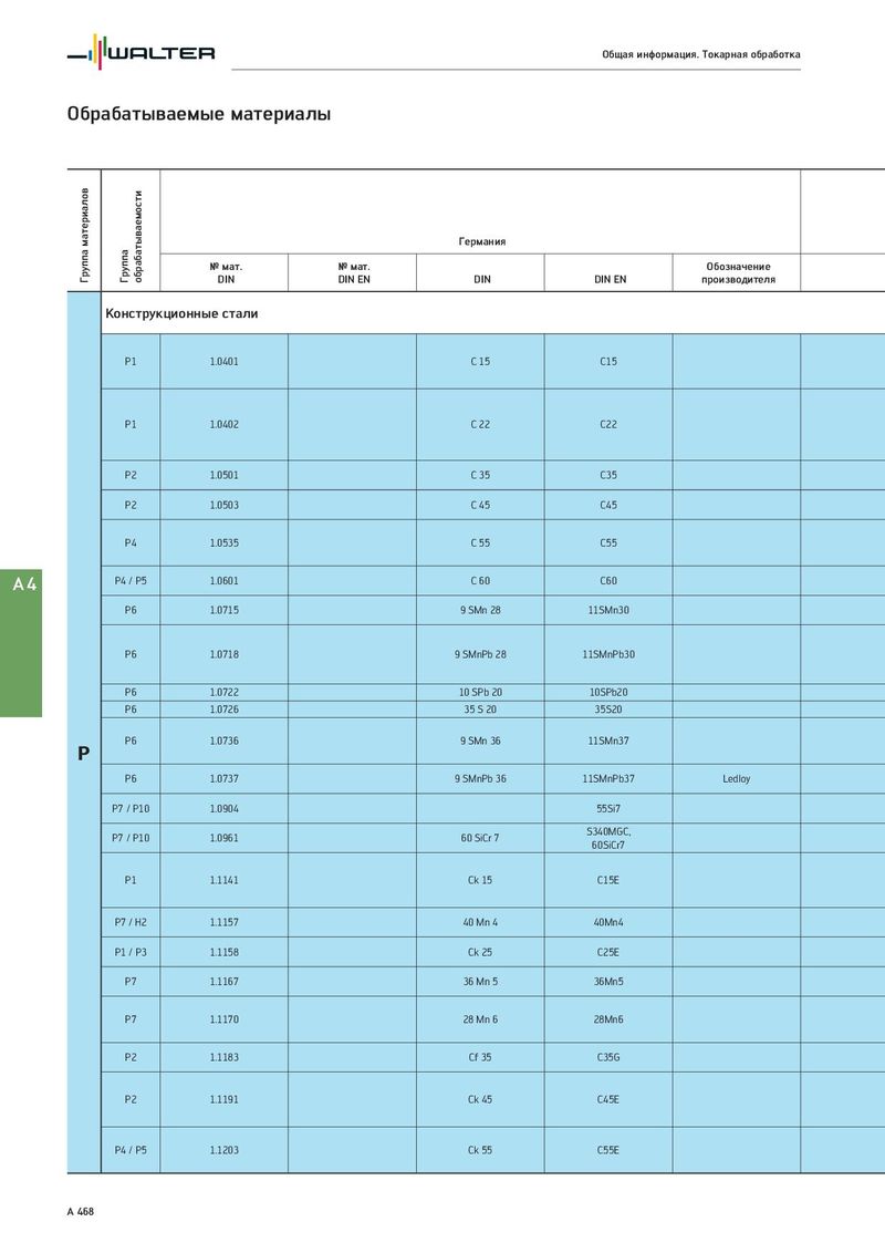 Общая информация. Токарная обработка Обрабатываемые материалы Группа материалов обрабатываемости Германия Группа № мат. № мат. Обозначение DIN DIN EN DIN DIN EN производителя Конструкционные стали P1 1.0401 C 15 C15 P1 1.0402 C 22 C22 P2 1.0501 C 35 C35 P2 1.0503 C 45 C45 P4 1.0535 C 55 C55 A4 P4 / P5 1.0601 C 60 C60 P6 1.0715 9 SMn 28 11SMn30 P6 1.0718 9 SMnPb 28 11SMnPb30 P6 1.0722 10 SPb 20 10SPb20 P6 1.0726 35 S 20 35S20 P6 1.0736 9 SMn 36 11SMn37 P P6 1.0737 9 SMnPb 36 11SMnPb37 Ledloy P7 / P10 1.0904 55Si7 P7 / P10 1.0961 60 SiCr 7 S340MGC, 60SiCr7 P1 1.1141 Ck 15 C15E P7 / H2 1.1157 40 Mn 4 40Mn4 P1 / P3 1.1158 Ck 25 C25E P7 1.1167 36 Mn 5 36Mn5 P7 1.1170 28 Mn 6 28Mn6 P2 1.1183 Cf 35 C35G P2 1.1191 Ck 45 C45E P4 / P5 1.1203 Ck 55 C55E A 468