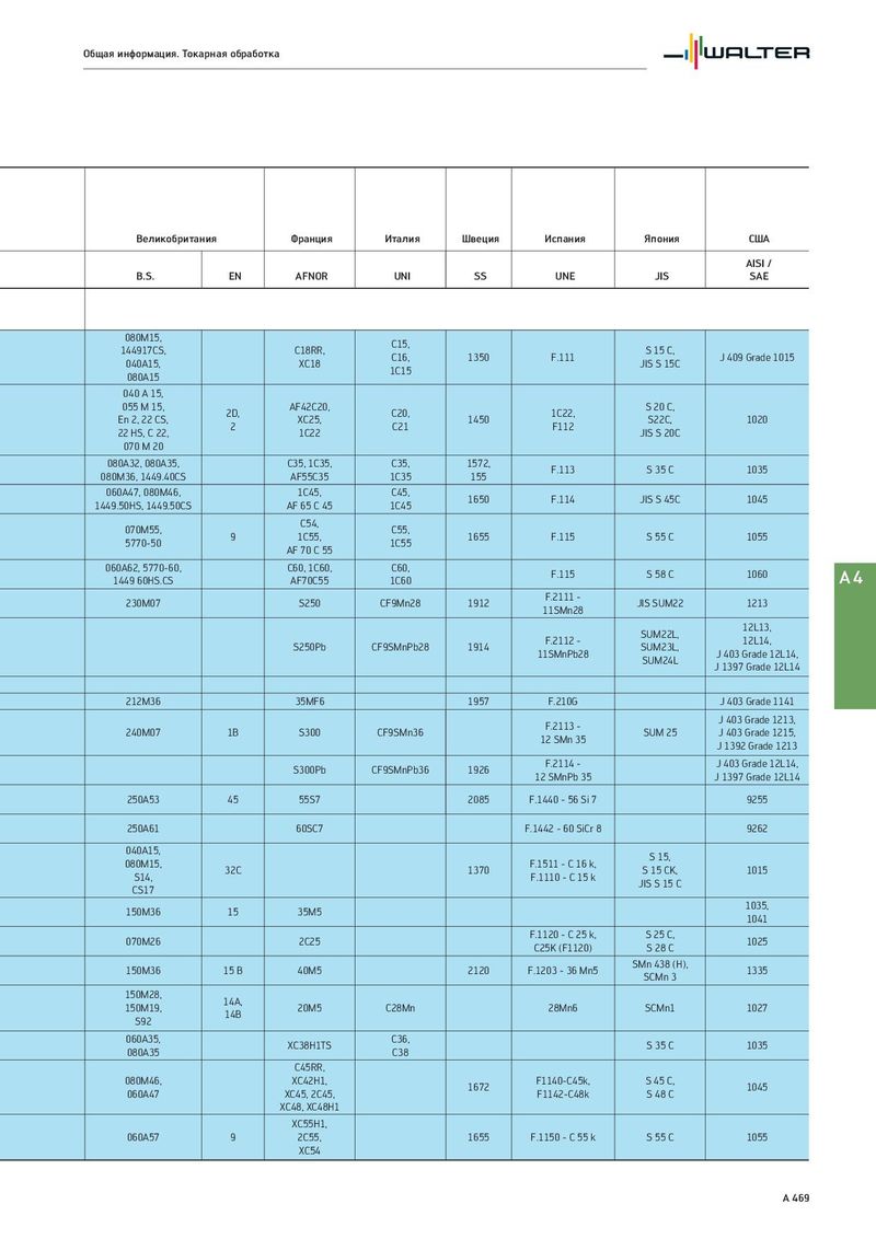 Общая информация. Токарная обработка Великобритания Франция Италия Швеция Испания Япония США AISI / B.S. EN AFNOR UNI SS UNE JIS SAE 080M15, C15, 144917CS, C18RR, C16, 1350 F.111 S 15 C, J 409 Grade 1015 040A15, XC18 1C15 JIS S 15C 080A15 040 A 15, 055 M 15, 2D, AF42C20, C20, 1C22, S 20 C, En 2, 22 CS, 2 XC25, C21 1450 F112 S22C, 1020 22 HS, C 22, 1C22 JIS S 20C 070 M 20 080A32, 080A35, C35, 1C35, C35, 1572, F.113 S 35 C 1035 080M36, 1449.40CS AF55C35 1C35 155 060A47, 080M46, 1C45, C45, 1650 F.114 JIS S 45C 1045 1449.50HS, 1449.50CS AF 65 C 45 1C45 070M55, C54, C55, 5770-50 9 1C55, 1C55 1655 F.115 S 55 C 1055 AF 70 C 55 060A62, 5770-60, C60, 1C60, C60, F.115 S 58 C 1060 A4 1449 60HS.CS AF70C55 1C60 230M07 S250 CF9Mn28 1912 F.2111 - JIS SUM22 1213 11SMn28 SUM22L, 12L13, S250Pb CF9SMnPb28 1914 F.2112 - SUM23L, 12L14, 11SMnPb28 SUM24L J 403 Grade 12L14, J 1397 Grade 12L14 212M36 35MF6 1957 F.210G J 403 Grade 1141 F.2113 - J 403 Grade 1213, 240M07 1B S300 CF9SMn36 12 SMn 35 SUM 25 J 403 Grade 1215, J 1392 Grade 1213 S300Pb CF9SMnPb36 1926 F.2114 - J 403 Grade 12L14, 12 SMnPb 35 J 1397 Grade 12L14 250A53 45 55S7 2085 F.1440 - 56 Si 7 9255 250A61 60SC7 F.1442 - 60 SiCr 8 9262 040A15, S 15, 080M15, 32C 1370 F.1511 - C 16 k, S 15 CK, 1015 S14, F.1110 - C 15 k JIS S 15 C CS17 150M36 15 35M5 1035, 1041 070M26 2C25 F.1120 - C 25 k, S 25 C, 1025 C25K (F1120) S 28 C 150M36 15 B 40M5 2120 F.1203 - 36 Mn5 SMn 438 (H), 1335 SCMn 3 150M28, 14A, 150M19, 14B 20M5 C28Mn 28Mn6 SCMn1 1027 S92 060A35, XC38H1TS C36, S 35 C 1035 080A35 C38 C45RR, 080M46, XC42H1, 1672 F1140-C45k, S 45 C, 1045 060A47 XC45, 2C45, F1142-C48k S 48 C XC48, XC48H1 XC55H1, 060A57 9 2C55, 1655 F.1150 - C 55 k S 55 C 1055 XC54 A 469