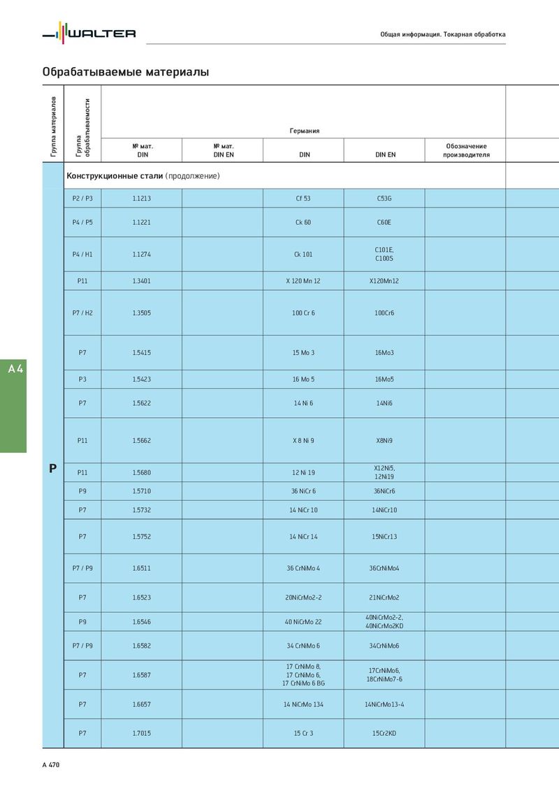 Общая информация. Токарная обработка Обрабатываемые материалы Группа материалов обрабатываемости Германия Группа № мат. № мат. Обозначение DIN DIN EN DIN DIN EN производителя Конструкционные стали (продолжение) P2 / P3 1.1213 Cf 53 C53G P4 / P5 1.1221 Ck 60 C60E P4 / H1 1.1274 Ck 101 C101E, C100S P11 1.3401 X 120 Mn 12 X120Mn12 P7 / H2 1.3505 100 Cr 6 100Cr6 P7 1.5415 15 Mo 3 16Mo3 A4 P3 1.5423 16 Mo 5 16Mo5 P7 1.5622 14 Ni 6 14Ni6 P11 1.5662 X 8 Ni 9 X8Ni9 P P11 1.5680 12 Ni 19 X12Ni5, 12Ni19 P9 1.5710 36 NiCr 6 36NiCr6 P7 1.5732 14 NiCr 10 14NiCr10 P7 1.5752 14 NiCr 14 15NiCr13 P7 / P9 1.6511 36 CrNiMo 4 36CrNiMo4 P7 1.6523 20NiCrMo2-2 21NiCrMo2 P9 1.6546 40 NiCrMo 22 40NiCrMo2-2, 40NiCrMo2KD P7 / P9 1.6582 34 CrNiMo 6 34CrNiMo6 17 CrNiMo 8, 17CrNiMo6, P7 1.6587 17 CrNiMo 6, 18CrNiMo7-6 17 CrNiMo 6 BG P7 1.6657 14 NiCrMo 134 14NiCrMo13-4 P7 1.7015 15 Cr 3 15Cr2KD A 470