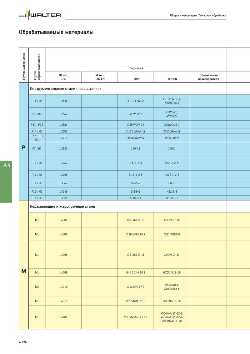 Общая информация. Токарная обработка Обрабатываемые материалы Группа материалов обрабатываемости Германия Группа № мат. № мат. Обозначение DIN DIN EN DIN DIN EN производителя Инструментальные стали (продолжение) P14 / H3 1.2436 X 210 CrW 12 X210CrW12-1, X210CrW12 P7 / H2 1.2542 45 WCrV 7 45WCrV8, 45WCrV7 P11 / P13 1.2581 X 30 WCrV 9 3 X30WCrV9-3 P14 / H3 1.2601 X 165 CrMoV 12 X165CrMoV12 P7 / P10 / 1.2713 55 NiCrMoV 6 55NiCrMoV6 H1 P P7 / H3 1.2833 100 V 1 100V1 A4 P11 / H3 1.3243 S 6-5-2-5 HS6-5-2-5 P11 / H3 1.3255 S 18-1-2-5 HS18-1-2-5 P11 / H3 1.3343 S 6-5-2 HS6-5-2 P11 / H3 1.3348 S 2-9-2 HS2-9-2 P11 / H3 1.3355 S 18-0-1 HS18-0-1 Нержавеющие и жаропрочные стали M1 1.4301 X 5 CrNi 18 10 X5CrNi18-10 M1 1.4305 X 10 CrNiS 18 9 X8CrNiS18-9 M1 1.4306 X 2 CrNi 19 11 X2CrNi19-11 M M1 1.4308 G-X 6 CrNi 18 9 GX5CrNi19-10 M2 1.4310 X 12 CrNi 17 7 X9CrNi18-8, X10CrNi18-8 M1 1.4311 X 2 CrNiN 18 10 X2CrNiN18-10 X5CrNiMo17-12-2, M1 1.4401 X 5 CrNiMo 17 12 2 X4CrNiMo17-12-2, X5CrNiMo18-10 A 476
