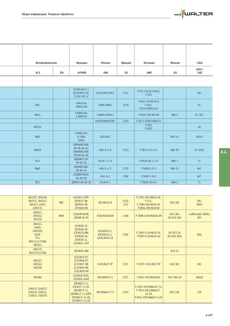 Общая информация. Токарная обработка Великобритания Франция Италия Швеция Испания Япония США AISI / B.S. EN AFNOR UNI SS UNE JIS SAE X210CrW12-1, F.5213 X210 CrW12, Z210CW12-01, X215CrW121KU 2312 F.521 D6 Z 210 CW 12 45WCrV8, F.5241 45 WCrSi 8, BS1 45WCrV20 45WCrV8KU 2710 F.524, S1 F524145WCrSi 8 BH21 X30WCrV9, X30WCrV93KU F.5323 X30 WCrV9 SKD 5 O1, H21 Z30WCV9 X165CrMoW12KU 2310 F.5211 X160 CrMoV12 BH224 F.528, L6 F520S C105E2UV1, BW2 Y1105V, 102V2KU SKS 43 W210 100V2 Z85WDKCV06- BM35 05-05-04-02, HS6-5-2-5 2723 F.5613 6-5-2-5 SKH 55 S7, M35 Z90WDKCV06- A4 05-05-04-02 BT4 Z80WKCV18- HS18-1-1-5 F.5530 18-1-1-5 SKH 3 T4 05-04-01 BM2 Z85WDCV06- HS6-5-2-5 2722 F.5603 6-5-2 SKH 51 M2 05-04-02 Z100DCWV09- HS2-9-2 2782 F.5607 2-9-2 M7 04-02-02 BT1 Z80WCV18-04-01 HS18-0-1 F.5520 18-0-1 SKH 2 T1 304S15, 304S16, Z4CN19-10FF, F.3451-X5 CrNi18-10, 304S31, 304S11, 58E Z5CN17-08, X5CrNi18 10 2332, F.314, SUS 304 304, 304S17, LW21, Z6CN18-09, 233 F.3504-X6CrNi19 10, 304H LWCF21 Z7CN18-09 F3504-X5CrNi1810 303S21, Z10CNF18.09, SUS 303, J 405 Grade 30303, 303S22, 58M Z8CNF18-09 X10CrNiS18 09 2346 F.3508-X10CrNiS18-09 JIS SUS 303 303 303S31 304S11, Z1CN18-12, LW20, Z2CN18-10, LWCF20, Z3CN19.10M, X3CrNi18 11, F.3503-X 2CrNi19-10, JIS SCS 19, S536, Z3CN18-10, X2CrNi18 11, 2352 F3503-X 2CrNi18-10 JIS SUS 304L 304L T74, Z3CN19-11, GX2CrNi19 10 304C12 (LT196), Z3CN19-11FF 305S11 304C15, Z6CN18.10M SCS 13 304C15 (LT196) Z12CN17.07, 301S21, Z12CN18.07, 301S22, Z11CN17-08, X12CrNi17 07 2331 F.3517-X12CrNi17 07 SUS 301 301 302S26 Z11CN18-08, Z12CN18-09 304S62 Z3CN18-07Az, X2CrNiN18 11 2371 F3541-X2CrNiN1810 SUS 304 LN 304LN Z3CN18-10AZ Z6CND17.11, 316S13, 316S17, Z3CD17-11-01, F.3543-X5CrNiMo17-12, 316S19, 316S31, Z6CND17-11, X5CrNiMo17 12 2347 F.3543-X6 CrNiMo17- SUS 316 316 316S33, 316S16 Z6CND17-11-02FF, 12-03, Z7CND17-11-02, F3543-X5CrNiMo17-122 Z7CND17-12-02 A 477