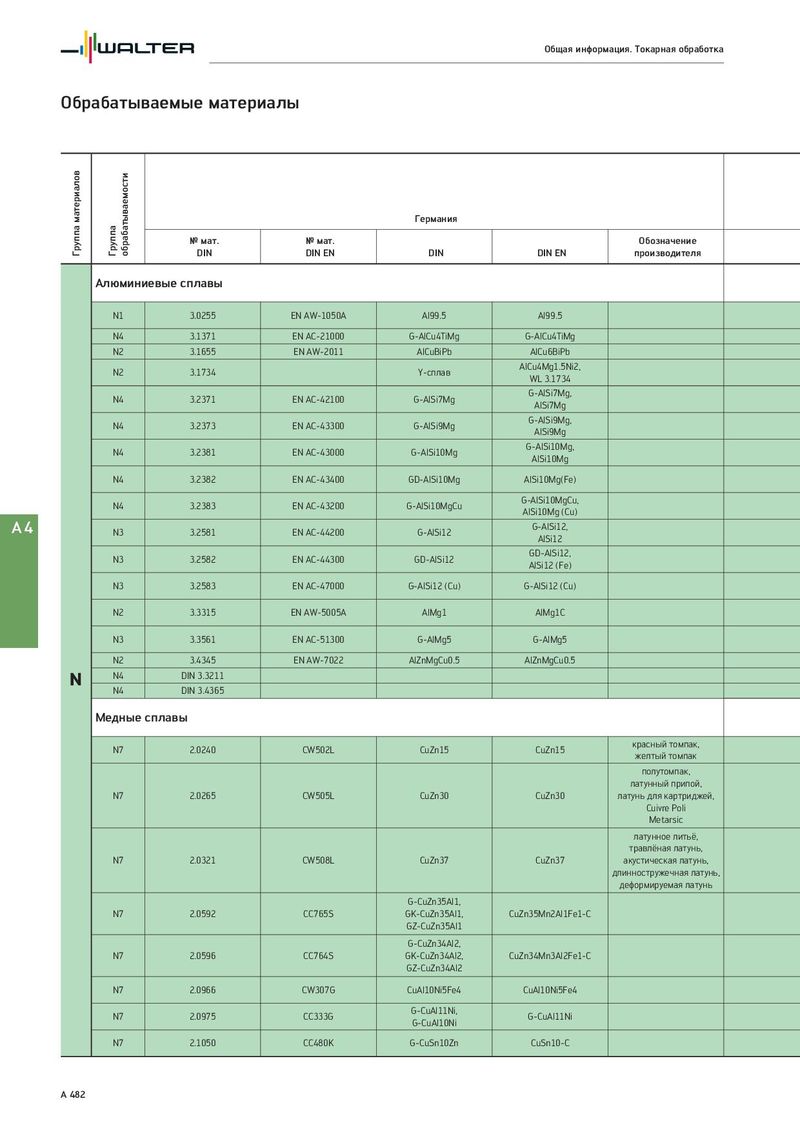 Общая информация. Токарная обработка Обрабатываемые материалы Группа материалов обрабатываемости Германия Группа № мат. № мат. Обозначение DIN DIN EN DIN DIN EN производителя Алюминиевые сплавы N1 3.0255 EN AW-1050A Al99.5 Al99.5 N4 3.1371 EN AC-21000 G-AlCu4TiMg G-AlCu4TiMg N2 3.1655 EN AW-2011 AlCuBiPb AlCu6BiPb N2 3.1734 Y-сплав AlCu4Mg1.5Ni2, WL 3.1734 N4 3.2371 EN AC-42100 G-AlSi7Mg G-AlSi7Mg, AlSi7Mg N4 3.2373 EN AC-43300 G-AlSi9Mg G-AlSi9Mg, AlSi9Mg N4 3.2381 EN AC-43000 G-AlSi10Mg G-AlSi10Mg, AlSi10Mg N4 3.2382 EN AC-43400 GD-AlSi10Mg AlSi10Mg(Fe) N4 3.2383 EN AC-43200 G-AlSi10MgCu G-AlSi10MgCu, AlSi10Mg (Cu) A4 N3 3.2581 EN AC-44200 G-AlSi12 G-AlSi12, AlSi12 N3 3.2582 EN AC-44300 GD-AlSi12 GD-AlSi12, AlSi12 (Fe) N3 3.2583 EN AC-47000 G-AlSi12 (Cu) G-AlSi12 (Cu) N2 3.3315 EN AW-5005A AlMg1 AlMg1C N3 3.3561 EN AC-51300 G-AlMg5 G-AlMg5 N2 3.4345 EN AW-7022 AlZnMgCu0.5 AlZnMgCu0.5 N N4 DIN 3.3211 N4 DIN 3.4365 Медные сплавы N7 2.0240 CW502L CuZn15 CuZn15 красный томпак, желтый томпак полутомпак, латунный припой, N7 2.0265 CW505L CuZn30 CuZn30 латунь для картриджей, Cuivre Poli Metarsic латунное литьё, травлёная латунь, N7 2.0321 CW508L CuZn37 CuZn37 акустическая латунь, длинностружечная латунь, деформируемая латунь G-CuZn35Al1, N7 2.0592 CC765S GK-CuZn35Al1, CuZn35Mn2Al1Fe1-C GZ-CuZn35Al1 G-CuZn34Al2, N7 2.0596 CC764S GK-CuZn34Al2, CuZn34Mn3Al2Fe1-C GZ-CuZn34Al2 N7 2.0966 CW307G CuAl10Ni5Fe4 CuAl10Ni5Fe4 N7 2.0975 CC333G G-CuAl11Ni, G-CuAl11Ni G-CuAl10Ni N7 2.1050 CC480K G-CuSn10Zn CuSn10-C A 482