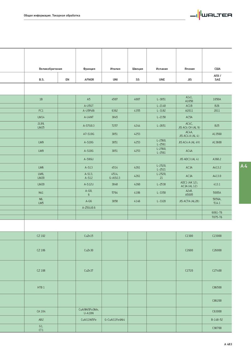 Общая информация. Токарная обработка Великобритания Франция Италия Швеция Испания Япония США AISI / B.S. EN AFNOR UNI SS UNE JIS SAE 1B A5 4507 4007 L-3051 A1x1, 1050A A1050 A-U5GT L-2140 AC1B B26 FC1 A-U5PbBi 6362 4355 L-3182 A2011 2011 LM14 A-U4NT 3045 L-2150 AC5A 2L99, A-S7G0.3 7257 4244 L-2651 AC4C, B25 LM25 JIS AC4 CH (AL 9) A7-S10G 3051 4253 AC4A, A13560 JIS AC4 A (AL 4) LM9 A-S10G 3051 4253 L-2560, JIS AC4 A (AL 4V) A13600 L-2561 LM9 A-S10G 3051 4253 L-2560, AC4A L-2561 A-S9GU JIS ADC3 (AL 4) A360.2 LM6 A-S13 4514 4261 L-2520, AC3A A413.2 A4 L-2521 LM6, A-S13, 4514, 4261 L-2520, AC3A A413.0 LM20 A-S12 G-AlSi13 21 LM20 A-S12U 3048 4260 L-2530 ADC1 (AK 12), 413.1 AC3A (AL 12) N41 A-G0, 5764 4106 L-3350 A2x8, 5005A 6 A5005 N6, A-G6 3058 4146 L-3320 JIS AC7A (AL28) 5056A, LM5 514.1 A-Z5GU0.6 6061-T6 7075-T6 CZ 102 CuZn15 C2300 C23000 CZ 106 CuZn30 C2600 C26000 CZ 108 CuZn37 C2720 C27400 HTB 1 C86500 C86200 CA 104 CuAl9Ni5Fe3Mn, C63000 U-A10N AB2 CuAl11Ni5Fe G-CuAl11Fe4Ni4 B-148-52 G1, C90700 CT1 A 483