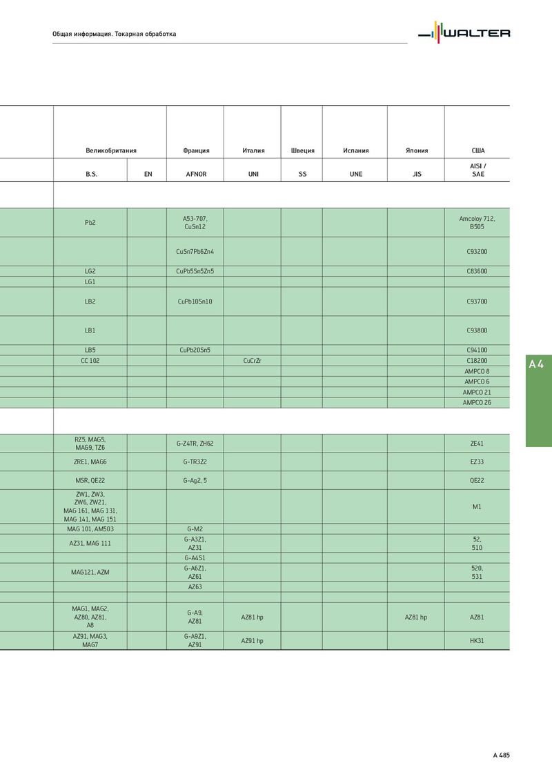 Общая информация. Токарная обработка Великобритания Франция Италия Швеция Испания Япония США AISI / B.S. EN AFNOR UNI SS UNE JIS SAE Pb2 A53-707, Amcoloy 712, CuSn12 B505 CuSn7Pb6Zn4 C93200 LG2 CuPb5Sn5Zn5 C83600 LG1 LB2 CuPb10Sn10 C93700 LB1 C93800 LB5 CuPb20Sn5 C94100 CC 102 CuCrZr C18200 A4 AMPCO 8 AMPCO 6 AMPCO 21 AMPCO 26 RZ5, MAG5, G-Z4TR, ZH62 ZE41 MAG9, TZ6 ZRE1, MAG6 G-TR3Z2 EZ33 MSR, QE22 G-Ag2, 5 QE22 ZW1, ZW3, ZW6, ZW21, M1 MAG 161, MAG 131, MAG 141, MAG 151 MAG 101, AM503 G-M2 AZ31, MAG 111 G-A3Z1, 52, AZ31 510 G-A4S1 MAG121, AZM G-A6Z1, 520, AZ61 531 AZ63 MAG1, MAG2, G-A9, AZ80, AZ81, AZ81 AZ81 hp AZ81 hp AZ81 A8 AZ91, MAG3, G-A9Z1, AZ91 hp HK31 MAG7 AZ91 A 485