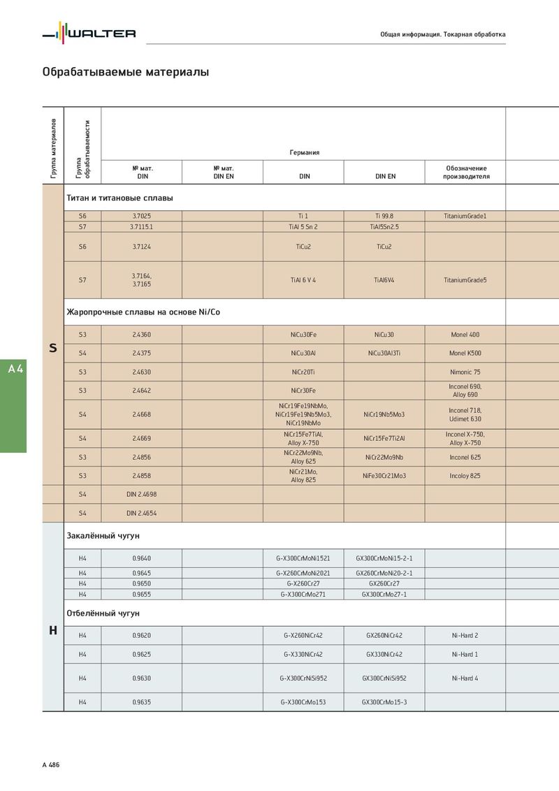 Общая информация. Токарная обработка Обрабатываемые материалы Группа материалов обрабатываемости Германия Группа № мат. № мат. Обозначение DIN DIN EN DIN DIN EN производителя Титан и титановые сплавы S6 3.7025 Ti 1 Ti 99.8 TitaniumGrade1 S7 3.7115.1 TiAl 5 Sn 2 TiAl5Sn2.5 S6 3.7124 TiCu2 TiCu2 S7 3.7164, TiAl 6 V 4 TiAl6V4 TitaniumGrade5 3.7165 Жаропрочные сплавы на основе Ni/Co S3 2.4360 NiCu30Fe NiCu30 Monel 400 S S4 2.4375 NiCu30Al NiCu30Al3Ti Monel K500 A4 S3 2.4630 NiCr20Ti Nimonic 75 S3 2.4642 NiCr30Fe Inconel 690, Alloy 690 NiCr19Fe19NbMo, Inconel 718, S4 2.4668 NiCr19Fe19Nb5Mo3, NiCr19Nb5Mo3 Udimet 630 NiCr19NbMo S4 2.4669 NiCr15Fe7TiAl, NiCr15Fe7Ti2Al Inconel X-750, Alloy X-750 Alloy X-750 S3 2.4856 NiCr22Mo9Nb, NiCr22Mo9Nb Inconel 625 Alloy 625 S3 2.4858 NiCr21Mo, NiFe30Cr21Mo3 Incoloy 825 Alloy 825 S4 DIN 2.4698 S4 DIN 2.4654 Закалённый чугун H4 0.9640 G-X300CrMoNi1521 GX300CrMoNi15-2-1 H4 0.9645 G-X260CrMoNi2021 GX260CrMoNi20-2-1 H4 0.9650 G-X260Cr27 GX260Cr27 H4 0.9655 G-X300CrMo271 GX300CrMo27-1 Отбелённый чугун H H4 0.9620 G-X260NiCr42 GX260NiCr42 Ni-Hard 2 H4 0.9625 G-X330NiCr42 GX330NiCr42 Ni-Hard 1 H4 0.9630 G-X300CrNiSi952 GX300CrNiSi952 Ni-Hard 4 H4 0.9635 G-X300CrMo153 GX300CrMo15-3 A 486