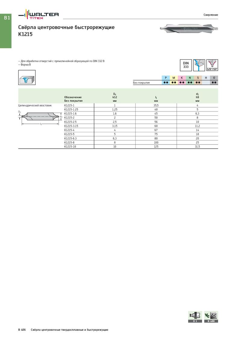 B1 Сверление Свёрла центровочные быстрорежущие K1215 – Для обработки отверстий с прямолинейной образующей по DIN 332 B DIN – Форма B 333 120°/60° P M K N S H O Без покрытия CC CC CC CC CC CC Dc d1 Обозначение k12 l1 h9 Без покрытия мм мм мм Цилиндрический хвостовик K1215-1 1 35,5 4 Dc K1215-1.25 1,25 40 5 K1215-1.6 1,6 45 6,3 d1 K1215-2 2 50 8 l1 K1215-2.5 2,5 56 10 K1215-3.15 3,15 60 11,2 K1215-4 4 67 14 K1215-5 5 75 18 K1215-6.3 6,3 80 20 K1215-8 8 100 25 K1215-10 10 125 31,5 D1 B 488 B 406 Свёрла центровочные твердосплавные и быстрорежущие
