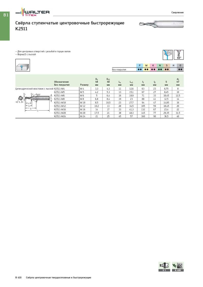 B1 Сверление Свёрла ступенчатые центровочные быстрорежущие K2511 – Для центровых отверстий с резьбой в торцах валов – Форма D с лыской 60° P M K N S H O Без покрытия CC CC CC CC CC CC Dc Dc1 d1 Обозначение h8 h8 Lc Lc1 l1 l2 S h7 Без покрытия Размер мм мм мм мм мм мм мм мм Цилиндрический хвостовик с лыской K2511-M4 M4 3,3 4,3 11 12,6 63 23 6,75 8 Dc Dc1 K2511-M5 M5 4,2 5,3 13 15,1 67 27 8,45 10 60° K2511-M6 M6 5 6,4 16 18,9 71 33 10,45 12,5 d1 K2511-M8 M8 6,8 8,4 19 23 88 41 12,5 14 S Lc K2511-M10 M 10 8,5 10,5 23 27,7 94 47 14,85 16 Lc1 K2511-M12 M 12 10,2 13 28 34,5 105 59 18,45 20 l2 K2511-M16 M 16 14 17 33 41,3 132 67 23,4 22 l1 K2511-M20 M 20 17,5 21 38 48,3 145 77 29,35 31,5 K2511-M24 M 24 21 25 45 57 160 90 36,5 40 D1 B 488 B 410 Свёрла центровочные твердосплавные и быстрорежущие