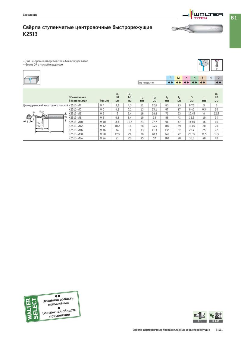 Сверление B1 Свёрла ступенчатые центровочные быстрорежущие K2513 – Для центровых отверстий с резьбой в торцах валов – Форма DR с лыской и радиусом r P M K N S H O Без покрытия CC CC CC CC CC CC Dc Dc1 d1 Обозначение h8 h8 Lc Lc1 l1 l2 S r h7 Без покрытия Размер мм мм мм мм мм мм мм мм мм Цилиндрический хвостовик с лыской K2513-M4 M4 3,3 4,3 11 12,6 63 23 6,75 5 8 Dc1 r K2513-M5 M5 4,2 5,3 13 15,1 67 27 8,45 6,3 10 Dc K2513-M6 M6 5 6,4 16 18,9 71 33 10,45 8 12,5 d1 K2513-M8 M8 6,8 8,4 19 23 88 41 12,5 10 14 S Lc K2513-M10 M 10 8,5 10,5 23 27,7 94 47 14,85 16 16 Lc1 K2513-M12 M 12 10,2 13 28 34,5 105 59 18,45 20 20 l2 K2513-M16 M 16 14 17 33 41,3 132 67 23,4 25 22 l1 K2513-M20 M 20 17,5 21 38 48,3 145 77 29,35 31,5 31,5 K2513-M24 M 24 21 25 45 57 160 90 36,5 40 40 Оснпорвинмаеяноебнлиаясть Возмпоржимнаеянеонбиляасть D1 B 488 Свёрла центровочные твердосплавные и быстрорежущие B 411