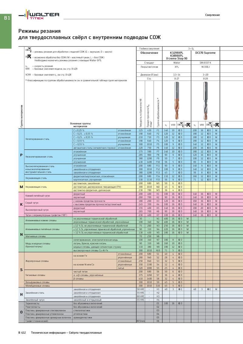 B1 Сверление Режимы резания для твердосплавных свёрл с внутренним подводом СОЖ Глубина сверления 3 × Dc = режимы резания для обработки с подачей СОЖ (E = эмульсия, O = масло) Обозначение K3299XPL DC170 Supreme = возможна обработка без СОЖ (M = масляный туман, L = без СОЖ) K3899XPL Необходимо назначить режимы резания с помощью Walter GPS. X·treme Step 90 Стандарт Walter DIN 6537 K vc = скорость резания Покрытие/сплав XPL WJ30EJ VRR = базовые значения подачи, см. стр. B 429 VCRR = базовые значения vc, см стр. B 428 Диапазон Ø [мм] 3,3–14 3–20 * Классификацию по группам обрабатываемости см. в сравнительной таблице групп материалов Стр. B 27 B 28 Группа материалов Основные группы Твёрдость по Бринеллю HB Предел прочности Rm Н/мм2 Группа обрабатываемости * vc VRR vc VRR материалов C ≤ 0,25 % отожжённая 125 430 P1 140 10 EO 200 16 EO M C > 0,25... ≤ 0,55 % отожжённая 190 640 P2 120 12 EO 180 12 EO M Нелегированная сталь C > 0,25... ≤ 0,55 % улучшенная 210 710 P3 120 12 EO 180 12 EO M C > 0,55 % отожжённая 190 640 P4 120 9 EO 180 12 EO M C > 0,55 % улучшенная 300 1010 P5 100 9 EO 140 12 EO M автоматная сталь (сегментная стружка) отожжённая 220 750 P6 140 12 EO 200 16 EO M отожжённая 175 590 P7 140 10 EO 180 12 EO M P Низколегированная сталь улучшенная 285 960 P8 90 9 EO 120 16 EO M улучшенная 380 1280 P9 50 7 EO 100 12 EO M улучшенная 430 1480 P10 56 5 EO 80 8 EO M Высоколегированная сталь отожжённая 200 680 P11 90 9 EO 140 9 EO M и высоколегированная закалённая и отпущенная 300 1010 P12 100 9 EO 140 12 EO M инструментальная сталь закалённая и отпущенная 380 1280 P13 45 7 EO 56 8 EO M Нержавеющая сталь ферритная/мартенситная, отожжённая 200 680 P14 110 12 EO 160 12 EO M мартенситная, улучшенная 330 1110 P15 56 9 EO 71 12 EO M аустенитная, закалённая 200 680 M1 50 6 EO M Нержавеющая сталь аустенитная, дисперсионно твердеющая (PH) 300 1010 M2 45 6 EO аустенитно-ферритная, дуплексная 230 780 M3 36 4 EO Ковкий литейный чугун ферритный 200 400 K1 100 16 EO 140 16 EO M перлитный 260 700 K2 90 16 EO 140 16 EO M Серый чугун с низким пределом прочности 180 200 K3 120 16 EO 160 16 EO M K с высоким пределом прочности/аустенитный 245 350 K4 100 16 EO 140 16 EO M Высокопрочный чугун ферритный 155 400 K5 140 16 EO 180 20 EO M перлитный 265 700 K6 90 16 EO 140 16 EO M Чугун с вермикулярным графитом (ЧВГ) 230 400 K7 100 16 EO 140 16 EO M Алюминиевые ковкие сплавы не упрочняемые термической обработкой 30 - N1 400 16 EO M упрочняемые термической обработкой, упрочнённые 100 340 N2 400 16 EO M ≤ 12 % Si, не упрочняемые термической обработкой 75 260 N3 250 16 EO M Алюминиевые литейные сплавы ≤ 12 % Si, упрочняемые термической обработкой, упрочнённые 90 310 N4 220 16 EO M N > 12 % Si, не упрочняемые термической обработкой 130 450 N5 180 16 EO M Магниевые сплавы 70 250 N6 нелегированная, электролитическая медь 100 340 N7 180 8 EO Медь и медные сплавы латунь, бронза, красная латунь 90 310 N8 160 10 EO (бронза/латунь) медные сплавы, дающие сегментную стружку 110 380 N9 180 12 EO высокопрочные сплавы Cu-Al-Fe 300 1010 N10 71 5 EO на основе Fe отожжённые 200 680 S1 40 4 EO упрочнённые 280 940 S2 28 4 EO Жаропрочные сплавы отожжённые 250 840 S3 32 5 EO на основе Ni или Co упрочнённые 350 1180 S4 12 4 EO S литьё 320 1080 S5 25 4 EO чистый титан 200 680 S6 50 6 EO Титановые сплавы α- и β-сплавы, упрочнённые 375 1260 S7 36 4 EO β-сплавы 410 1400 S8 32 4 EO Вольфрамовые сплавы 300 1010 S9 45 5 EO Молибденовые сплавы 300 1010 S10 45 5 EO закалённая и отпущенная 50 HRC - H1 40 3 OE 40 3 OE M H Закалённая сталь закалённая и отпущенная 55 HRC - H2 закалённая и отпущенная 60 HRC - H3 Закалённый чугун закалённый и отпущенный 55 HRC - H4 Термопласты без абразивных включений O1 100 16 EO Реактопласты без абразивных включений O2 O Пластики, армированные стекловолокном стеклопластики O3 Пластики, армированные углеволокном углепластики O4 Пластики, армированные арамидным волокном арамидопластики O5 Графит (технический) 80 Shore 