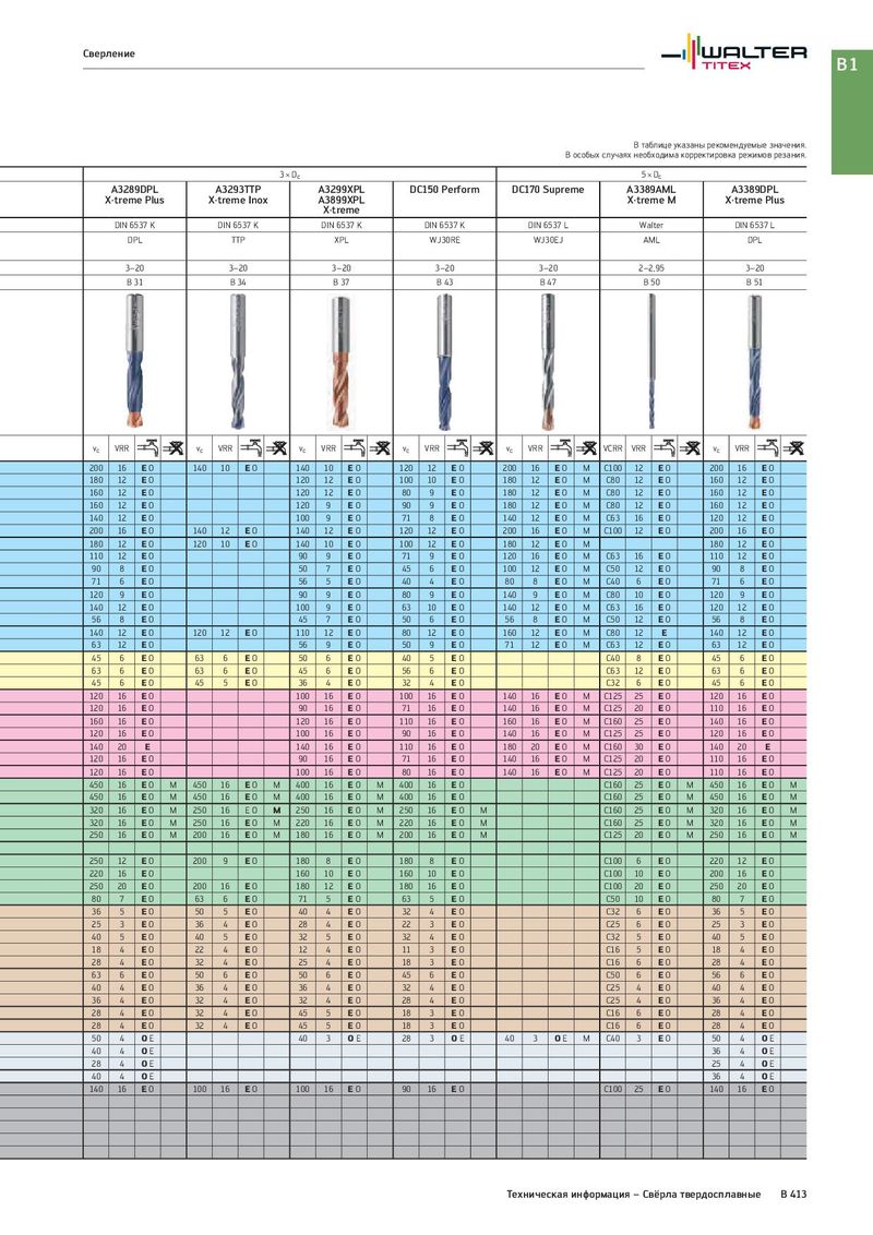 Сверление B1 В таблице указаны рекомендуемые значения. В особых случаях необходима корректировка режимов резания. 3 × Dc 5 × Dc A3289DPL A3293TTP A3299XPL DC150 Perform DC170 Supreme A3389AML A3389DPL X·treme Plus X·treme Inox A3899XPL X·treme M X·treme Plus X·treme DIN 6537 K DIN 6537 K DIN 6537 K DIN 6537 K DIN 6537 L Walter DIN 6537 L DPL TTP XPL WJ30RE WJ30EJ AML DPL 3–20 3–20 3–20 3–20 3–20 2–2,95 3–20 B 31 B 34 B 37 B 43 B 47 B 50 B 51 vc VRR vc VRR vc VRR vc VRR vc VRR VCRR VRR vc VRR 200 16 EO 140 10 EO 140 10 EO 120 12 EO 200 16 EO M C100 12 EO 200 16 EO 180 12 EO 120 12 EO 100 10 EO 180 12 EO M C80 12 EO 160 12 EO 160 12 EO 120 12 EO 80 9 EO 180 12 EO M C80 12 EO 160 12 EO 160 12 EO 120 9 EO 90 9 EO 180 12 EO M C80 12 EO 160 12 EO 140 12 EO 100 9 EO 71 8 EO 140 12 EO M C63 16 EO 120 12 EO 200 16 EO 140 12 EO 140 12 EO 120 12 EO 200 16 EO M C100 12 EO 200 16 EO 180 12 EO 120 10 EO 140 10 EO 100 12 EO 180 12 EO M 180 12 EO 110 12 EO 90 9 EO 71 9 EO 120 16 EO M C63 16 EO 110 12 EO 90 8 EO 50 7 EO 45 6 EO 100 12 EO M C50 12 EO 90 8 EO 71 6 EO 56 5 EO 40 4 EO 80 8 EO M C40 6 EO 71 6 EO 120 9 EO 90 9 EO 80 9 EO 140 9 EO M C80 10 EO 120 9 EO 140 12 EO 100 9 EO 63 10 EO 140 12 EO M C63 16 EO 120 12 EO 56 8 EO 45 7 EO 50 6 EO 56 8 EO M C50 12 EO 56 8 EO 140 12 EO 120 12 EO 110 12 EO 80 12 EO 160 12 EO M C80 12 E 140 12 EO 63 12 EO 56 9 EO 50 9 EO 71 12 EO M C63 12 EO 63 12 EO 45 6 EO 63 6 EO 50 6 EO 40 5 EO C40 8 EO 45 6 EO 63 6 EO 63 6 EO 45 6 EO 56 6 EO C63 12 EO 63 6 EO 45 6 EO 45 5 EO 36 4 EO 32 4 EO C32 6 EO 45 6 EO 120 16 EO 100 16 EO 100 16 EO 140 16 EO M C125 25 EO 120 16 EO 120 16 EO 90 16 EO 71 16 EO 140 16 EO M C125 20 EO 110 16 EO 160 16 EO 120 16 EO 110 16 EO 160 16 EO M C160 25 EO 140 16 EO 120 16 EO 100 16 EO 90 16 EO 140 16 EO M C125 25 EO 120 16 EO 140 20 E 140 16 EO 110 16 EO 180 20 EO M C160 30 EO 140 20 E 120 16 EO 90 16 EO 71 16 EO 140 16 EO M C125 20 EO 110 16 EO 120 16 EO 100 16 EO 80 16 EO 140 16 EO M C125 20 EO 110 16 EO 450 16 EO M 450 16 EO M 400 16 EO M 400 16 EO C160 25 EO M 450 16 EO M 450 16 EO M 450 16 EO M 400 16 EO M 400 16 EO C160 25 EO M 450 16 EO M 320 16 EO M 250 16 EO M 250 16 EO M 250 16 EO M C160 25 EO M 320 16 EO M 320 16 EO M 250 16 EO M 220 16 EO M 220 16 EO M C160 25 EO M 320 16 EO M 250 16 EO M 200 16 EO M 180 16 EO M 200 16 EO M C125 20 EO M 250 16 EO M 250 12 EO 200 9 EO 180 8 EO 180 8 EO C100 6 EO 220 12 EO 220 16 EO 160 10 EO 160 10 EO C100 10 EO 200 16 EO 250 20 EO 200 16 EO 180 12 EO 180 16 EO C100 20 EO 250 20 EO 80 7 EO 63 6 EO 71 5 EO 63 5 EO C50 10 EO 80 7 EO 36 5 EO 50 5 EO 40 4 EO 32 4 EO C32 6 EO 36 5 EO 25 3 EO 36 4 EO 28 4 EO 22 3 EO C25 6 EO 25 3 EO 40 5 EO 40 5 EO 32 5 EO 32 4 EO C32 5 EO 40 5 EO 18 4 EO 22 4 EO 12 4 EO 11 3 EO C16 5 EO 18 4 EO 28 4 EO 32 4 EO 25 4 EO 18 3 EO C16 6 EO 28 4 EO 63 6 EO 50 6 EO 50 6 EO 45 6 EO C50 6 EO 56 6 EO 40 4 EO 36 4 EO 36 4 EO 32 4 EO C25 4 EO 40 4 EO 36 4 EO 32 4 EO 32 4 EO 28 4 EO C25 4 EO 36 4 EO 28 4 EO 32 4 EO 45 5 EO 18 3 EO C16 6 EO 28 4 EO 28 4 EO 32 4 EO 45 5 EO 18 3 EO C16 6 EO 28 4 EO 50 4 OE 40 3 OE 28 3 OE 40 3 OE M C40 3 EO 50 4 OE 40 4 OE 36 4 OE 28 4 OE 25 4 OE 40 4 OE 36 4 OE 140 16 EO 100 16 EO 100 16 EO 90 16 EO C100 25 EO 140 16 EO Техническая информация – Свёрла твердосплавные B 413