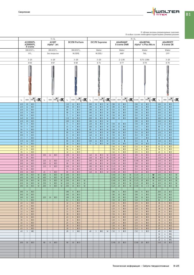 Сверление B1 В таблице указаны рекомендуемые значения. В особых случаях необходима корректировка режимов резания. 5 × Dc 8 × Dc A3399XPL A3387 DC150 Perform DC170 Supreme A6489AMP A6488TML A6489DPP A3999XPL Alpha® Jet X·treme DM8 Alpha® 4 Plus Micro X·treme D8 X·treme DIN 6537 L DIN 6537 L DIN 6537 L Walter Walter Walter Walter XPL Без покрытия WJ30RE WJ30EJ AMP TML DPP 3–25 4–20 3–20 3–20 2–2,95 0,75–1,984 3–20 B 60 B 67 B 68 B 74 B 77 B 78 B 79 vc VRR vc VRR vc VRR vc VRR VCRR VRR VCRR VRR vc VRR 120 10 EO 110 12 EO 200 16 EO M C80 12 EO C80 12 EO 180 16 E O 120 12 EO 100 10 EO 180 12 EO M C80 12 EO C80 12 EO 160 12 E O 120 12 EO 80 9 EO 180 12 EO M C63 12 EO C80 12 EO 160 12 E O 120 9 EO 90 9 EO 180 12 EO M C80 12 EO C80 12 EO 160 12 E O 100 9 EO 71 8 EO 140 12 EO M C50 16 EO C63 10 EO 120 12 E O 140 12 EO 110 12 EO 200 16 EO M C80 12 EO C80 12 EO 180 16 E O 120 10 EO 100 12 EO 180 12 EO M C80 12 EO 160 12 E O 90 9 EO 71 9 EO 120 16 EO M C50 16 EO C50 10 EO 110 12 E O 50 7 EO 45 6 EO 100 12 EO M C50 12 EO C40 7 EO 80 8 E O 56 5 EO 36 4 EO 80 8 EO M C40 6 EO C32 6 EO 63 6 E O 80 9 EO 80 9 EO 140 9 EO M C80 10 EO C63 10 EO 120 9 E O 100 9 EO 63 10 EO 140 12 EO M C50 16 EO C63 10 EO 120 12 E O 45 7 EO 50 6 EO 56 8 EO M C50 12 EO C40 7 EO 50 8 E O 110 12 EO 80 12 EO 160 12 EO M C63 12 E C63 12 E 140 12 E O 56 9 EO 50 9 EO 71 12 EO M C50 12 EO C50 10 EO 63 12 E O 50 6 EO 40 5 EO C40 8 EO C32 8 EO 45 6 E O 45 6 EO 56 6 EO C50 12 EO C40 6 EO 56 6 E O 36 4 EO 32 4 EO C32 6 EO C25 6 EO 40 6 E O 100 16 EO 100 12 EO 100 16 EO 140 16 EO M C100 25 EO C80 16 EO 120 16 E O 90 16 EO 71 16 EO 140 16 EO M C100 20 EO C63 12 EO 110 16 E O 120 16 EO 120 12 EO 110 16 EO 160 16 EO M C125 25 EO C100 16 EO 140 16 E O 100 16 EO 100 12 EO 90 16 EO 140 16 EO M C100 25 EO C80 12 EO 120 16 E O 140 16 EO 110 8 EO 100 16 EO 180 20 EO M C125 30 EO C80 16 EO 160 20 E O 90 16 EO 71 16 EO 140 16 EO M C100 20 EO C63 12 EO 110 16 E O 100 16 EO 45 3 EO 80 16 EO 140 16 EO M C100 20 EO C63 12 EO 120 16 E O 400 16 EO M 400 9 EO M 400 16 EO C160 25 EO M C125 20 EO M 450 16 E O M 400 16 EO M 400 9 EO M 400 16 EO C160 25 EO M C125 20 EO M 450 16 E O M 250 16 EO M 250 9 EO M 250 16 EO M C160 25 EO M C125 20 EO M 320 16 E O M 220 16 EO M 250 9 EO M 220 16 EO M C160 25 EO M C125 20 EO M 320 16 E O M 180 16 EO M 200 9 EO M 200 16 EO M C125 20 EO M C100 16 EO M 250 16 E O M 180 8 EO 180 8 EO C80 6 EO C80 6 EO 200 12 E O 160 10 EO 160 10 EO C80 10 EO C80 9 EO 180 16 E O 180 12 EO 220 16 EO 180 16 EO C80 20 EO C80 16 EO 250 20 E O 71 5 EO 63 5 EO C50 10 EO C40 5 EO 80 7 E O 40 4 EO 32 4 EO C32 6 EO C25 6 EO 36 5 E O 28 4 EO 22 3 EO C20 6 EO C20 4 EO 25 3 E O 32 5 EO 32 4 EO C25 5 EO C20 6 EO 36 5 E O 12 4 EO 11 3 EO C16 5 EO C12 5 EO 16 4 E O 25 4 EO 18 3 EO C16 6 EO C12 6 EO 25 4 E O 50 6 EO 45 6 EO C40 6 EO C40 6 EO 50 6 E O 36 4 EO 32 4 EO C25 4 EO C25 4 EO 36 4 E O 32 4 EO 25 4 EO C20 4 EO C25 4 EO 32 4 E O 45 5 EO 18 3 EO C16 6 EO C12 6 EO 25 4 E O 45 5 EO 18 3 EO C16 6 EO C12 6 EO 25 4 E O 40 3 OE 28 3 OE 40 3 OE M C32 3 EO C32 3 EO 40 4 O E 32 4 O E 22 4 O E 32 4 O E 100 16 EO 80 8 EO 90 16 EO C100 25 EO C100 20 EO 140 16 E O Техническая информация – Свёрла твердосплавные B 415