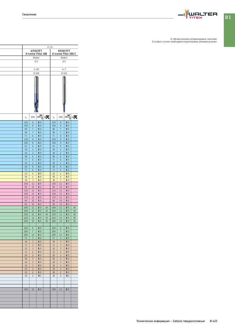 Сверление B1 В таблице указаны рекомендуемые значения. В особых случаях необходима корректировка режимов резания. 2 × Dc A7191TFT K5191TFT X·treme Pilot 180 X·treme Pilot 180 C Walter Walter TFT TFT 3–20 4–7 B 120 B 122 vc VRR vc VRR 120 9 EO 120 9 EO 100 8 EO 100 8 EO 80 7 EO 80 7 EO 90 7 EO 90 7 EO 71 6 EO 71 6 EO 120 9 EO 120 9 EO 100 8 EO 100 8 EO 63 6 EO 63 6 EO 50 4 EO 50 4 EO 40 2 EO 40 2 EO 90 6 EO 90 6 EO 71 6 EO 71 6 EO 50 4 EO 50 4 EO 90 8 EO 90 8 EO 71 6 EO 71 6 EO 45 4 EO 45 4 EO 56 4 EO 56 4 EO 36 3 EO 36 3 EO 100 12 EO 100 12 EO 80 10 EO 80 10 EO 120 12 EO 120 12 EO 100 12 EO 100 12 EO 110 12 EO 110 12 EO 80 10 EO 80 10 EO 80 10 EO 80 10 EO 400 12 EO M 400 12 EO M 400 12 EO M 400 12 EO M 250 12 EO M 250 12 EO M 220 12 EO M 220 12 EO M 200 10 EO M 200 10 EO M 220 6 EO 220 6 EO 200 7 EO 200 7 EO 200 12 EO 200 12 EO 71 5 EO 71 5 EO 36 3 EO 36 3 EO 11 3 EO 11 3 EO 32 3 EO 32 3 EO 12 2 EO 12 2 EO 20 2 EO 20 2 EO 56 5 EO 56 5 EO 40 3 EO 40 3 EO 32 3 EO 32 3 EO 20 2 EO 20 2 EO 20 2 EO 20 2 EO 36 2 OE 36 2 OE 100 12 EO 100 12 EO Техническая информация – Свёрла твердосплавные B 423