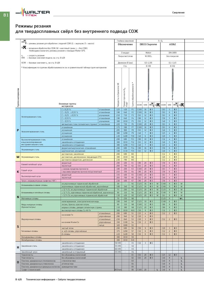 B1 Сверление Режимы резания для твердосплавных свёрл без внутреннего подвода СОЖ Глубина сверления 5 × Dc = режимы резания для обработки с подачей СОЖ (E = эмульсия, O = масло) Обозначение DB133 Supreme A3162 = возможна обработка без СОЖ (M = масляный туман, L = без СОЖ) Необходимо назначить режимы резания с помощью Walter GPS. Стандарт Walter DIN 1899 vc = скорость резания Покрытие/сплав WJ30EL Без покрытия VRR = базовые значения подачи, см. стр. B 429 VCRR = базовые значения vc, см стр. B 428 Диапазон Ø [мм] 0,5–2,95 0,1–1,45 * Классификацию по группам обрабатываемости см. в сравнительной таблице групп материалов Стр. B 150 B 152 Группа материалов Основные группы Твёрдость по Бринеллю HB Предел прочности Rm Н/мм2 Группа обрабатываемости * VCRR VRR VCRR VRR материалов C ≤ 0,25 % отожжённая 125 430 P1 C100 16 EO C63 5 EO C > 0,25... ≤ 0,55 % отожжённая 190 640 P2 C100 16 EO C63 6 EO Нелегированная сталь C > 0,25... ≤ 0,55 % улучшенная 210 710 P3 C63 12 EO C63 6 EO C > 0,55 % отожжённая 190 640 P4 C80 12 EO C50 5 EO C > 0,55 % улучшенная 300 1010 P5 C63 12 EO C40 5 EO автоматная сталь (сегментная стружка) отожжённая 220 750 P6 C100 20 EO C63 6 EO отожжённая 175 590 P7 C100 16 EO C63 6 EO P Низколегированная сталь улучшенная 285 960 P8 C63 12 EO C40 5 EO улучшенная 380 1280 P9 C40 7 EO C25 4 EO улучшенная 430 1480 P10 C40 6 EO C20 3 EO Высоколегированная сталь отожжённая 200 680 P11 C80 10 EO C32 4 EO и высоколегированная закалённая и отпущенная 300 1010 P12 C63 12 EO C40 5 EO инструментальная сталь закалённая и отпущенная 380 1280 P13 C40 7 EO C25 4 EO Нержавеющая сталь ферритная/мартенситная, отожжённая 200 680 P14 C80 16 EO C50 6 EO мартенситная, улучшенная 330 1110 P15 C63 12 EO C40 5 EO аустенитная, закалённая 200 680 M1 C12 3 EO M Нержавеющая сталь аустенитная, дисперсионно твердеющая (PH) 300 1010 M2 C20 3 EO аустенитно-ферритная, дуплексная 230 780 M3 C12 2 EO Ковкий литейный чугун ферритный 200 400 K1 C80 20 EO C50 6 EO перлитный 260 700 K2 C63 20 EO C40 4 EO Серый чугун с низким пределом прочности 180 200 K3 C100 20 EO C63 7 EO K с высоким пределом прочности/аустенитный 245 350 K4 C80 20 EO C50 6 EO Высокопрочный чугун ферритный 155 400 K5 C100 25 EO C63 7 EO перлитный 265 700 K6 C63 20 EO C40 4 EO Чугун с вермикулярным графитом (ЧВГ) 230 400 K7 C80 20 EO C50 5 EO Алюминиевые ковкие сплавы не упрочняемые термической обработкой 30 - N1 C125 16 EO M C160 9 EO M упрочняемые термической обработкой, упрочнённые 100 340 N2 C125 16 EO M C160 9 EO M ≤ 12 % Si, не упрочняемые термической обработкой 75 260 N3 C125 20 EO M C125 9 EO M Алюминиевые литейные сплавы ≤ 12 % Si, упрочняемые термической обработкой, упрочнённые 90 310 N4 C125 20 EO M C100 9 EO M N > 12 % Si, не упрочняемые термической обработкой 130 450 N5 C125 20 EO M C63 8 EO M Магниевые сплавы 70 250 N6 C125 9 ML нелегированная, электролитическая медь 100 340 N7 C125 10 EO C100 6 EO Медь и медные сплавы латунь, бронза, красная латунь 90 310 N8 C100 12 EO C80 8 EO (бронза/латунь) медные сплавы, дающие сегментную стружку 110 380 N9 C125 20 EO C80 8 EO высокопрочные сплавы Cu-Al-Fe 300 1010 N10 C50 9 EO C32 3 EO на основе Fe отожжённые 200 680 S1 C25 4 EO C12 2 EO упрочнённые 280 940 S2 C20 4 EO Жаропрочные сплавы отожжённые 250 840 S3 C20 3 EO C12 2 EO на основе Ni или Co упрочнённые 350 1180 S4 C16 2 EO S литьё 320 1080 S5 чистый титан 200 680 S6 C50 9 EO C20 3 EO Титановые сплавы α- и β-сплавы, упрочнённые 375 1260 S7 C32 6 EO C12 2 EO β-сплавы 410 1400 S8 C32 6 EO C12 1 EO Вольфрамовые сплавы 300 1010 S9 Молибденовые сплавы 300 1010 S10 закалённая и отпущенная 50 HRC - H1 C32 3 OE H Закалённая сталь закалённая и отпущенная 55 HRC - H2 закалённая и отпущенная 60 HRC - H3 Закалённый чугун закалённый и отпущенный 55 HRC - H4 Термопласты без абразивных включений O1 C63 20 EO C25 12 EO Реактопласты без абразивных включений O2 C63 20 EO C40 8 L O Пластики, армированные стекловолокном стеклопластики O3 C40 8 L Пластики, армированные углеволокном углепластики O4 C40 8 L Пласти
