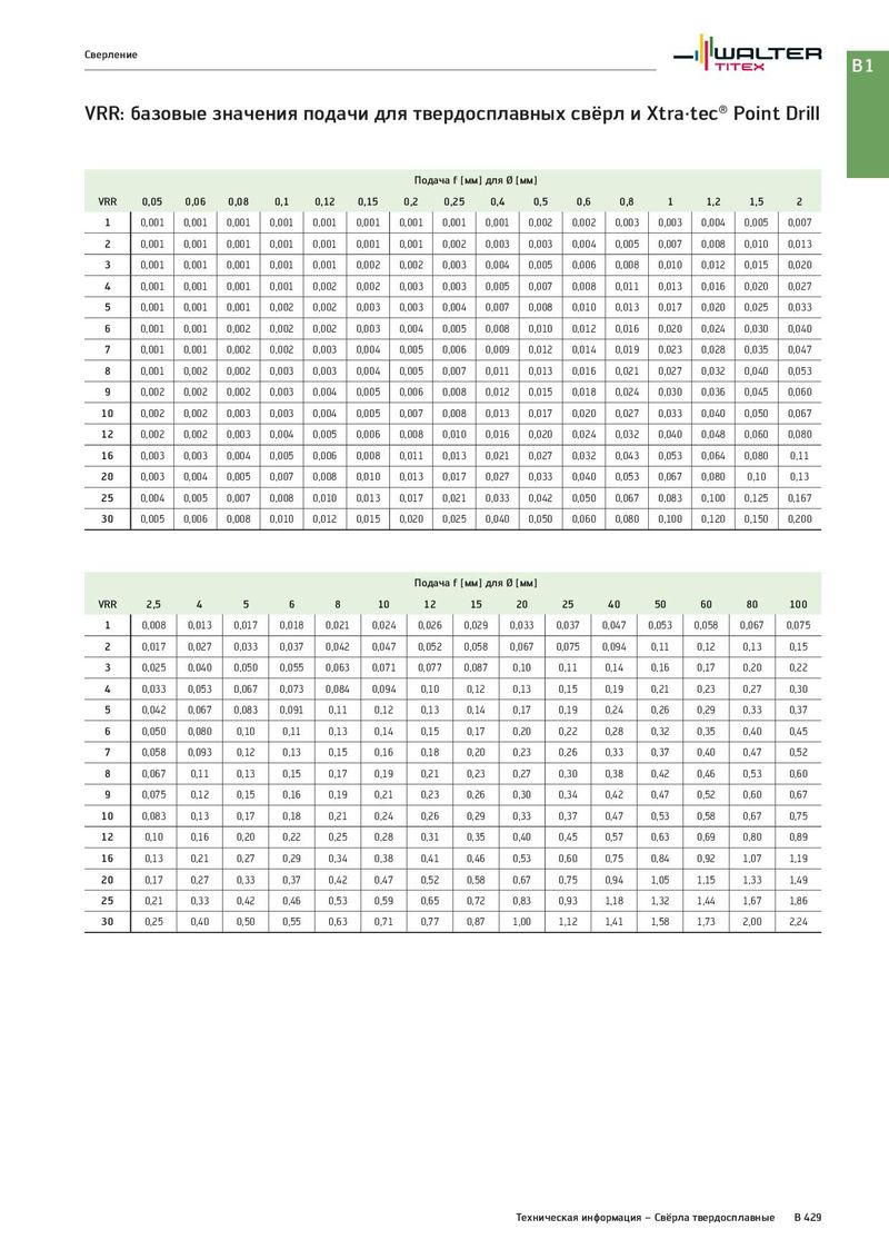 Сверление B1 VRR: базовые значения подачи для твердосплавных свёрл и Xtra·tec® Point Drill Подача f [мм] для Ø [мм] VRR 0,05 0,06 0,08 0,1 0,12 0,15 0,2 0,25 0,4 0,5 0,6 0,8 1 1,2 1,5 2 1 0,001 0,001 0,001 0,001 0,001 0,001 0,001 0,001 0,001 0,002 0,002 0,003 0,003 0,004 0,005 0,007 2 0,001 0,001 0,001 0,001 0,001 0,001 0,001 0,002 0,003 0,003 0,004 0,005 0,007 0,008 0,010 0,013 3 0,001 0,001 0,001 0,001 0,001 0,002 0,002 0,003 0,004 0,005 0,006 0,008 0,010 0,012 0,015 0,020 4 0,001 0,001 0,001 0,001 0,002 0,002 0,003 0,003 0,005 0,007 0,008 0,011 0,013 0,016 0,020 0,027 5 0,001 0,001 0,001 0,002 0,002 0,003 0,003 0,004 0,007 0,008 0,010 0,013 0,017 0,020 0,025 0,033 6 0,001 0,001 0,002 0,002 0,002 0,003 0,004 0,005 0,008 0,010 0,012 0,016 0,020 0,024 0,030 0,040 7 0,001 0,001 0,002 0,002 0,003 0,004 0,005 0,006 0,009 0,012 0,014 0,019 0,023 0,028 0,035 0,047 8 0,001 0,002 0,002 0,003 0,003 0,004 0,005 0,007 0,011 0,013 0,016 0,021 0,027 0,032 0,040 0,053 9 0,002 0,002 0,002 0,003 0,004 0,005 0,006 0,008 0,012 0,015 0,018 0,024 0,030 0,036 0,045 0,060 10 0,002 0,002 0,003 0,003 0,004 0,005 0,007 0,008 0,013 0,017 0,020 0,027 0,033 0,040 0,050 0,067 12 0,002 0,002 0,003 0,004 0,005 0,006 0,008 0,010 0,016 0,020 0,024 0,032 0,040 0,048 0,060 0,080 16 0,003 0,003 0,004 0,005 0,006 0,008 0,011 0,013 0,021 0,027 0,032 0,043 0,053 0,064 0,080 0,11 20 0,003 0,004 0,005 0,007 0,008 0,010 0,013 0,017 0,027 0,033 0,040 0,053 0,067 0,080 0,10 0,13 25 0,004 0,005 0,007 0,008 0,010 0,013 0,017 0,021 0,033 0,042 0,050 0,067 0,083 0,100 0,125 0,167 30 0,005 0,006 0,008 0,010 0,012 0,015 0,020 0,025 0,040 0,050 0,060 0,080 0,100 0,120 0,150 0,200 Подача f [мм] для Ø [мм] VRR 2,5 4 5 6 8 10 12 15 20 25 40 50 60 80 100 1 0,008 0,013 0,017 0,018 0,021 0,024 0,026 0,029 0,033 0,037 0,047 0,053 0,058 0,067 0,075 2 0,017 0,027 0,033 0,037 0,042 0,047 0,052 0,058 0,067 0,075 0,094 0,11 0,12 0,13 0,15 3 0,025 0,040 0,050 0,055 0,063 0,071 0,077 0,087 0,10 0,11 0,14 0,16 0,17 0,20 0,22 4 0,033 0,053 0,067 0,073 0,084 0,094 0,10 0,12 0,13 0,15 0,19 0,21 0,23 0,27 0,30 5 0,042 0,067 0,083 0,091 0,11 0,12 0,13 0,14 0,17 0,19 0,24 0,26 0,29 0,33 0,37 6 0,050 0,080 0,10 0,11 0,13 0,14 0,15 0,17 0,20 0,22 0,28 0,32 0,35 0,40 0,45 7 0,058 0,093 0,12 0,13 0,15 0,16 0,18 0,20 0,23 0,26 0,33 0,37 0,40 0,47 0,52 8 0,067 0,11 0,13 0,15 0,17 0,19 0,21 0,23 0,27 0,30 0,38 0,42 0,46 0,53 0,60 9 0,075 0,12 0,15 0,16 0,19 0,21 0,23 0,26 0,30 0,34 0,42 0,47 0,52 0,60 0,67 10 0,083 0,13 0,17 0,18 0,21 0,24 0,26 0,29 0,33 0,37 0,47 0,53 0,58 0,67 0,75 12 0,10 0,16 0,20 0,22 0,25 0,28 0,31 0,35 0,40 0,45 0,57 0,63 0,69 0,80 0,89 16 0,13 0,21 0,27 0,29 0,34 0,38 0,41 0,46 0,53 0,60 0,75 0,84 0,92 1,07 1,19 20 0,17 0,27 0,33 0,37 0,42 0,47 0,52 0,58 0,67 0,75 0,94 1,05 1,15 1,33 1,49 25 0,21 0,33 0,42 0,46 0,53 0,59 0,65 0,72 0,83 0,93 1,18 1,32 1,44 1,67 1,86 30 0,25 0,40 0,50 0,55 0,63 0,71 0,77 0,87 1,00 1,12 1,41 1,58 1,73 2,00 2,24 Техническая информация – Свёрла твердосплавные B 429
