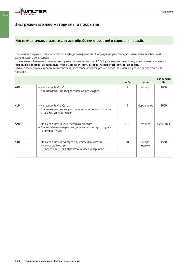 B1 Сверление Инструментальные материалы и покрытия Инструментальные материалы для обработки отверстий и нарезания резьбы В основном, твёрдые сплавы состоят из карбида вольфрама (WC), определяющего твёрдость материала, и кобальта (Co), выполняющего роль связки. Содержание кобальта в большинстве случаев составляет от 6 до 12 %. При этом действует следующее основное правило: Чем выше содержание кобальта, тем выше прочность и ниже износостойкость и наоборот. Другой определяющей характеристикой твёрдых сплавов является размер зерна. Чем меньше размер зерна, тем выше твёрдость. Твёрдость Co, % Зерно HV K05 – Износостойкий субстрат 4 Мелкое 1800 – Для изготовления твердосплавных резьбофрез K10 – Износостойкий субстрат 6 Нормальное 1650 – Для изготовления твердосплавных центровочных свёрл с напайными пластинами K20F – Мелкозернистый износостойкий субстрат 6–7 Мелкое 1650–1800 – Для обработки материалов, дающих сегментную стружку, например, чугуна K30F – Мелкозернистый субстрат с высокой прочностью 10 Ультра- 1550 и износостойкостью мелкое – Универсальный, для обработки многих материалов B 430 Техническая информация – Свёрла твердосплавные