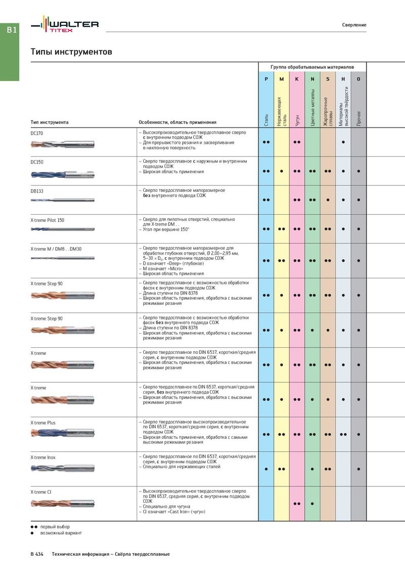 B1 Сверление Типы инструментов Группа обрабатываемых материалов P M K N S H O Тип инструмента Особенности, область применения Сталь Нержавеющая сталь Чугун Цветные металлы Жаропрочные сплавы Материалы высокой твёрдости Прочее DC170 − Высокопроизводительное твердосплавное сверло с внутренним подводом СОЖ − Для прерывистого резания и засверливания CC CC C в наклонную поверхность DC150 − Сверло твердосплавное с наружным и внутренним подводом СОЖ − Широкая область применения CC C CC CC CC C C DB133 − Сверло твердосплавное малоразмерное без внутреннего подвода СОЖ CC CC CC C C C X·treme Pilot 150 − Сверло для пилотных отверстий, специально для X·treme DM . . − Угол при вершине 150° CC CC CC CC CC C C X·treme M / DM8 . . DM30 − Сверло твердосплавное малоразмерное для обработки глубоких отверстий, Ø 2,00–2,95 мм, 5–30 × Dc, с внутренним подводом СОЖ CC CC CC CC CC C C − D означает «Deep» (глубокое) − M означает «Micro» − Широкая область применения X·treme Step 90 − Сверло твердосплавное с возможностью обработки фасок с внутренним подводом СОЖ − Длина ступени по DIN 8378 CC C CC CC CC C C − Широкая область применения, обработка с высокими режимами резания X·treme Step 90 − Сверло твердосплавное с возможностью обработки фасок без внутреннего подвода СОЖ − Длина ступени по DIN 8378 CC C CC C C C C − Широкая область применения, обработка с высокими режимами резания X·treme − Сверло твердосплавное по DIN 6537, короткая/средняя серия, с внутренним подводом СОЖ − Широкая область применения, обработка с высокими CC C CC CC CC C C режимами резания X·treme − Сверло твердосплавное по DIN 6537, короткая/средняя серия, без внутреннего подвода СОЖ − Широкая область применения, обработка с высокими CC C CC C C C C режимами резания X·treme Plus − Сверло твердосплавное высокопроизводительное по DIN 6537, короткая/средняя серия, с внутренним подводом СОЖ CC CC CC CC CC CC C − Широкая область применения, обработка с самыми высокими режимами резания X·treme Inox − Сверло твердосплавное по DIN 6537, короткая/средняя серия, с внутренним подводом СОЖ − Специально для нержавеющих сталей C CC C CC C X·treme CI − Высокопроизводительное твердосплавное сверло по DIN 6537, средняя серия, с внутренним подводом СОЖ CC C − Специально для чугуна − CI означает «Cast Iron» (чугун) CC первый выбор C возможный вариант B 434 Техническая информация – Свёрла твердосплавные