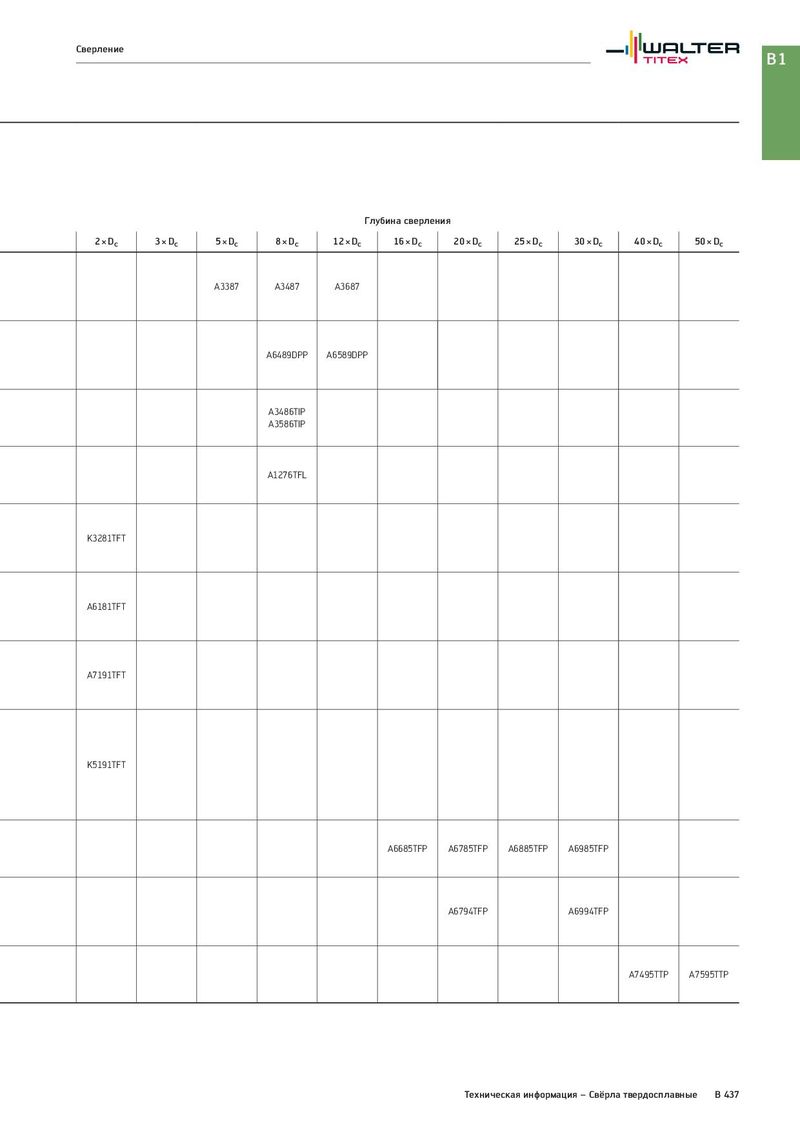 Сверление B1 Глубина сверления 2 × Dc 3 × Dc 5 × Dc 8 × Dc 12 × Dc 16 × Dc 20 × Dc 25 × Dc 30 × Dc 40 × Dc 50 × Dc A3387 A3487 A3687 A6489DPP A6589DPP A3486TIP A3586TIP A1276TFL K3281TFT A6181TFT A7191TFT K5191TFT A6685TFP A6785TFP A6885TFP A6985TFP A6794TFP A6994TFP A7495TTP A7595TTP Техническая информация – Свёрла твердосплавные B 437