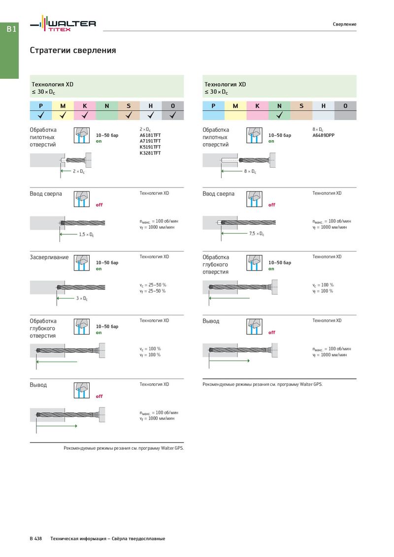B1 Сверление Стратегии сверления Технология XD Технология XD ≤ 30 × Dc ≤ 30 × Dc P M K N S H O P M K N S H O Обработка 2 × Dc Обработка 8 × Dc пилотных 10–50 бар A6181TFT пилотных 10–50 бар A6489DPP отверстий on A7191TFT отверстий on K5191TFT K3281TFT 2 × Dc 8 × Dc Ввод сверла Технология XD Ввод сверла Технология XD off off nмакс. = 100 об/мин nмакс. = 100 об/мин vf = 1000 мм/мин vf = 1000 мм/мин 1,5 × Dc 7,5 × Dc Засверливание Технология XD Обработка Технология XD 10–50 бар глубокого 10–50 бар on отверстия on vc = 25–50 % vc = 100 % vf = 25–50 % vf = 100 % 3 × Dc Обработка Технология XD Вывод Технология XD глубокого 10–50 бар отверстия on off vc = 100 % nмакс. = 100 об/мин vf = 100 % vf = 1000 мм/мин Вывод Технология XD Рекомендуемые режимы резания см. программу Walter GPS. off nмакс. = 100 об/мин vf = 1000 мм/мин Рекомендуемые режимы резания см. программу Walter GPS. B 438 Техническая информация – Свёрла твердосплавные