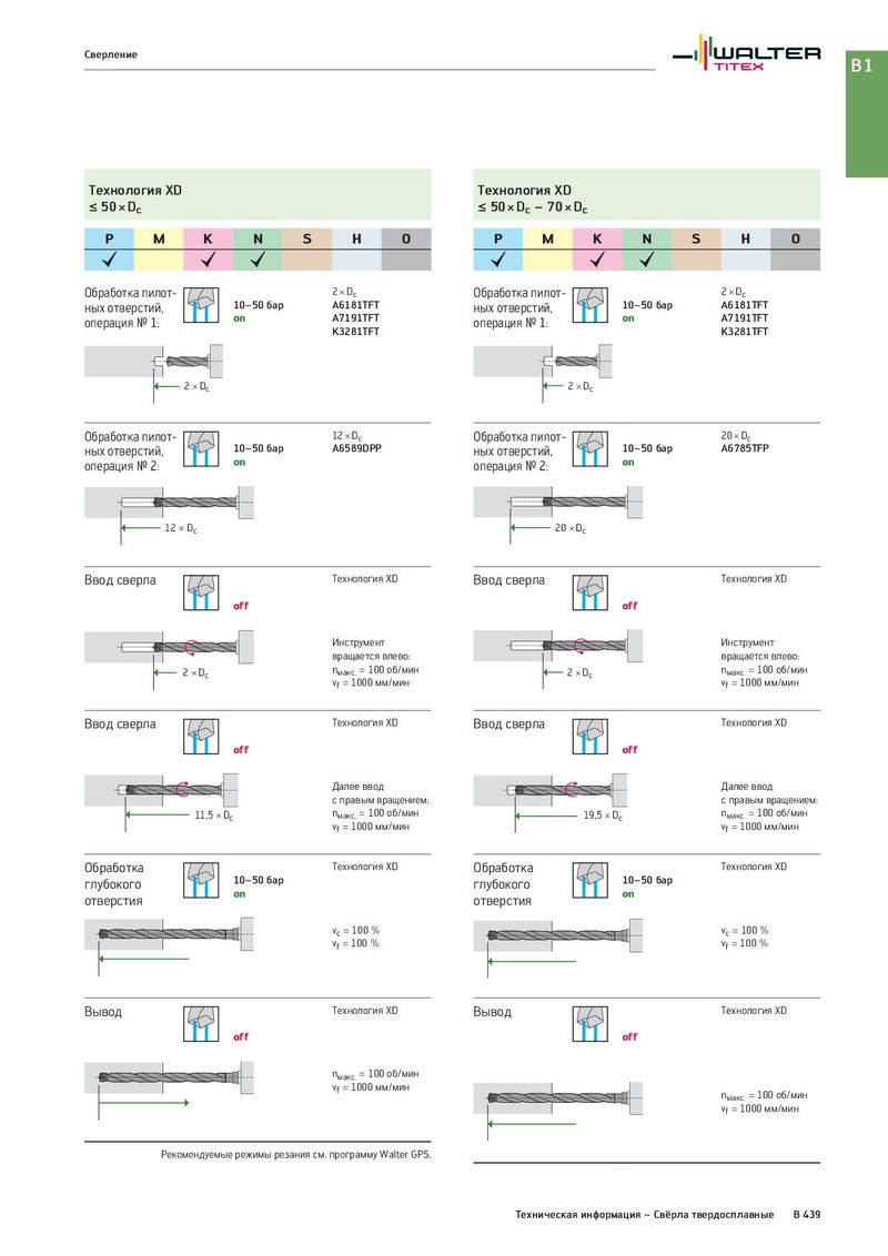Сверление B1 Технология XD Технология XD ≤ 50 × Dc ≤ 50 × Dc – 70 × Dc P M K N S H O P M K N S H O Обработка пилот- 2 × Dc Обработка пилот- 2 × Dc ных отверстий, 10–50 бар A6181TFT ных отверстий, 10–50 бар A6181TFT операция № 1: on A7191TFT операция № 1: on A7191TFT K3281TFT K3281TFT 2 × Dc 2 × Dc Обработка пилот- 12 × Dc Обработка пилот- 20 × Dc ных отверстий, 10–50 бар A6589DPP ных отверстий, 10–50 бар A6785TFP операция № 2: on операция № 2: on 12 × Dc 20 × Dc Ввод сверла Технология XD Ввод сверла Технология XD off off Инструмент Инструмент вращается влево: вращается влево: 2 × Dc nмакс. = 100 об/мин 2 × Dc nмакс. = 100 об/мин vf = 1000 мм/мин vf = 1000 мм/мин Ввод сверла Технология XD Ввод сверла Технология XD off off Далее ввод Далее ввод с правым вращением: с правым вращением: 11,5 × Dc nмакс. = 100 об/мин 19,5 × Dc nмакс. = 100 об/мин vf = 1000 мм/мин vf = 1000 мм/мин Обработка Технология XD Обработка Технология XD глубокого 10–50 бар глубокого 10–50 бар отверстия on отверстия on vc = 100 % vc = 100 % vf = 100 % vf = 100 % Вывод Технология XD Вывод Технология XD off off nмакс. = 100 об/мин vf = 1000 мм/мин nмакс. = 100 об/мин vf = 1000 мм/мин Рекомендуемые режимы резания см. программу Walter GPS. Техническая информация – Свёрла твердосплавные B 439