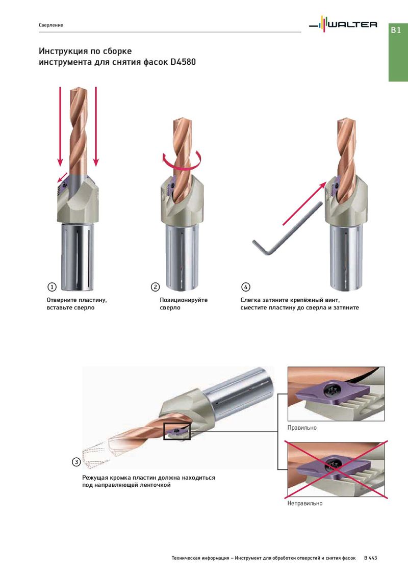 Сверление B1 Инструкция по сборке инструмента для снятия фасок D4580 x y { Отверните пластину, Позиционируйте Слегка затяните крепёжный винт, вставьте сверло сверло сместите пластину до сверла и затяните Правильно z Режущая кромка пластин должна находиться под направляющей ленточкой Неправильно Техническая информация – Инструмент для обработки отверстий и снятия фасок B 443