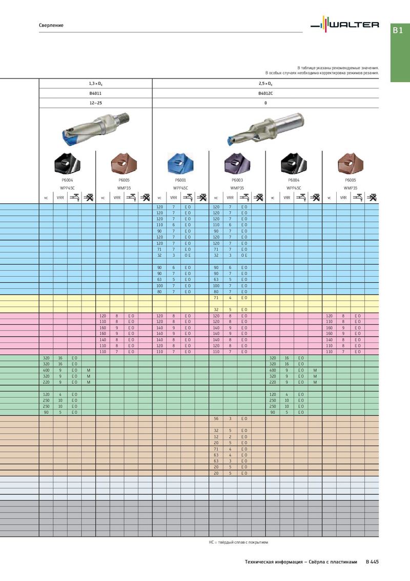 Сверление B1 В таблице указаны рекомендуемые значения. В особых случаях необходима корректировка режимов резания. 1,3 × Dc 2,5 × Dc B4011 B4012C 12–25 0 P6004 P6005 P6001 P6003 P6004 P6005 WPP45C WMP35 WPP45C WMP35 WPP45C WMP35 vc VRR vc VRR vc VRR vc VRR vc VRR vc VRR 120 7 EO 120 7 EO 120 7 EO 120 7 EO 120 7 EO 120 7 EO 110 6 EO 110 6 EO 90 7 EO 90 7 EO 120 7 EO 120 7 EO 120 7 EO 120 7 EO 71 7 EO 71 7 EO 32 3 OE 32 3 OE 90 6 EO 90 6 EO 90 7 EO 90 7 EO 63 5 EO 63 5 EO 100 7 EO 100 7 EO 80 7 EO 80 7 EO 71 4 EO 32 5 EO 120 8 EO 120 8 EO 120 8 EO 120 8 E O 110 8 EO 120 8 EO 120 8 EO 110 8 E O 160 9 EO 140 9 EO 140 9 EO 160 9 E O 160 9 EO 140 9 EO 140 9 EO 160 9 E O 140 8 EO 140 8 EO 140 8 EO 140 8 E O 110 8 EO 120 8 EO 120 8 EO 110 8 E O 110 7 EO 110 7 EO 110 7 EO 110 7 E O 320 16 EO 320 16 EO 320 16 EO 320 16 EO 400 9 EO M 400 9 EO M 320 9 EO M 320 9 EO M 220 9 EO M 220 9 EO M 120 4 EO 120 4 EO 250 10 EO 250 10 EO 250 10 EO 250 10 EO 90 5 EO 90 5 EO 56 3 EO 32 5 EO 12 2 EO 20 5 EO 71 4 EO 63 4 EO 63 3 EO 20 5 EO 20 5 EO HC = твёрдый сплав с покрытием Техническая информация – Свёрла с пластинами B 445