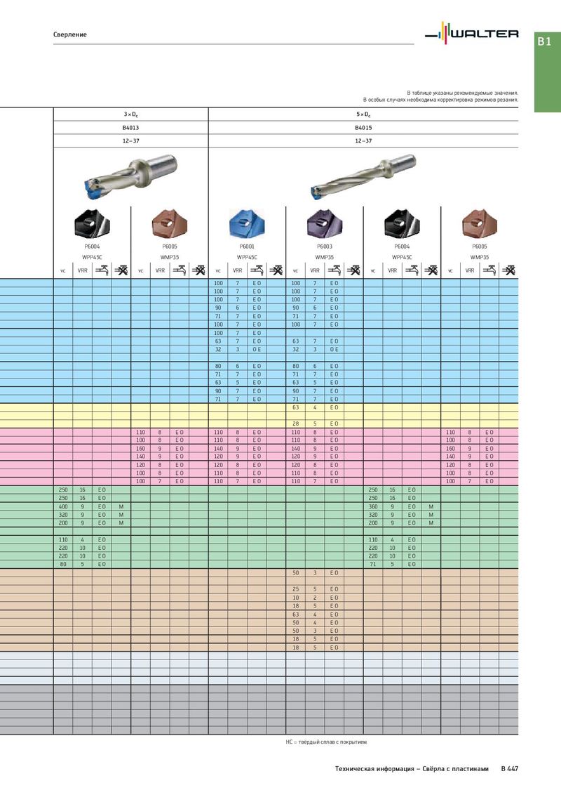 Сверление B1 В таблице указаны рекомендуемые значения. В особых случаях необходима корректировка режимов резания. 3 × Dc 5 × Dc B4013 B4015 12–37 12–37 P6004 P6005 P6001 P6003 P6004 P6005 WPP45C WMP35 WPP45C WMP35 WPP45C WMP35 vc VRR vc VRR vc VRR vc VRR vc VRR vc VRR 100 7 EO 100 7 EO 100 7 EO 100 7 EO 100 7 EO 100 7 EO 90 6 EO 90 6 EO 71 7 EO 71 7 EO 100 7 EO 100 7 EO 100 7 EO 63 7 EO 63 7 EO 32 3 OE 32 3 OE 80 6 EO 80 6 EO 71 7 EO 71 7 EO 63 5 EO 63 5 EO 90 7 EO 90 7 EO 71 7 EO 71 7 EO 63 4 EO 28 5 EO 110 8 EO 110 8 EO 110 8 EO 110 8 E O 100 8 EO 110 8 EO 110 8 EO 100 8 E O 160 9 EO 140 9 EO 140 9 EO 160 9 E O 140 9 EO 120 9 EO 120 9 EO 140 9 E O 120 8 EO 120 8 EO 120 8 EO 120 8 E O 100 8 EO 110 8 EO 110 8 EO 100 8 E O 100 7 EO 110 7 EO 110 7 EO 100 7 E O 250 16 EO 250 16 EO 250 16 EO 250 16 EO 400 9 EO M 360 9 EO M 320 9 EO M 320 9 EO M 200 9 EO M 200 9 EO M 110 4 EO 110 4 EO 220 10 EO 220 10 EO 220 10 EO 220 10 EO 80 5 EO 71 5 EO 50 3 EO 25 5 EO 10 2 EO 18 5 EO 63 4 EO 50 4 EO 50 3 EO 18 5 EO 18 5 EO HC = твёрдый сплав с покрытием Техническая информация – Свёрла с пластинами B 447