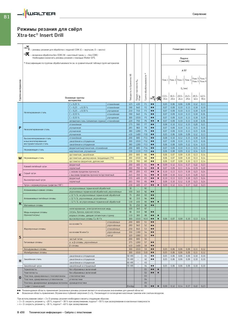 B1 Сверление Режимы резания для свёрл Xtra·tec® Insert Drill = режимы резания для обработки с подачей СОЖ (E = эмульсия, O = масло) Геометрия пластины = возможна обработка без СОЖ (M = масляный туман, L = без СОЖ) Необходимо назначить режимы резания с помощью Walter GPS. Подача f [мм/об] * Классификацию по группам обрабатываемости см. в сравнительной таблице групп материалов A 57 Группа материалов Твёрдость по Бринеллю HB Предел прочности Rm Группа обрабатываемости * Разм. 1 Разм. 2 Разм. 3 Разм. 4 Разм. 5 Разм. 7 Разм. 6 Разм. 8 Dc [мм] Основные группы Н/мм2 13,5– 16,5– 20,5– 24,5– 29,5– 42,5– материалов 16,4 20,4 24,4 29,4 42,4 59,4 C ≤ 0,25 % отожжённая 125 430 P1 CC 0,05 0,06 0,06 0,09 0,12 0,13 C > 0,25 ... ≤ 0,55 % отожжённая 190 640 P2 CC 0,07 0,09 0,10 0,13 0,18 0,19 Нелегированная сталь C > 0,25 ... ≤ 0,55 % улучшенная 210 710 P3 CC 0,07 0,09 0,10 0,13 0,18 0,19 C > 0,55 % отожжённая 190 640 P4 CC 0,07 0,09 0,10 0,13 0,18 0,19, C > 0,55 % улучшенная 300 1010 P5 CC 0,07 0,09 0,10 0,13 0,18 0,19 автоматная сталь (сегментная стружка) отожжённая 220 750 P6 CC C 0,07 0,09 0,10 0,13 0,18 0,19, отожжённая 175 590 P7 CC 0,08 0,10 0,12 0,15 0,20 0,21 P Низколегированная сталь улучшенная 285 960 P8 CC 0,07 0,09 0,10 0,13 0,15 0,16 улучшенная 380 1280 P9 CC 0,07 0,09 0,10 0,13 0,15 0,16 улучшенная 430 1480 P10 CC 0,05 0,06 0,06 0,09 0,12 0,13 Высоколегированная сталь отожжённая 200 680 P11 CC 0,08 0,10 0,12 0,15 0,18 0,19 и высоколегированная закалённая и отпущенная 300 1010 P12 CC 0,07 0,09 0,10 0,13 0,15 0,16 инструментальная сталь закалённая и отпущенная 380 1280 P13 CC 0,06 0,08 0,09 0,12 0,14 0,15 Нержавеющая сталь ферритная/мартенситная, отожжённая 200 680 P14 CC 0,07 0,09 0,10 0,13 0,15 0,16 мартенситная, улучшенная 330 1110 P15 CC 0,06 0,08 0,09 0,12 0,14 0,15 аустенитная, закалённая 200 680 M1 CC 0,06 0,07 0,08 0,10 0,13 0,14 M Нержавеющая сталь аустенитная, дисперсионно твердеющая (PH) 300 1010 M2 CC 0,06 0,07 0,08 0,10 0,13 0,14 аустенитно-ферритная, дуплексная 230 780 M3 CC 0,06 0,07 0,08 0,10 0,13 0,14 Ковкий литейный чугун ферритный 200 400 K1 CC C 0,09 0,12 0,14 0,17 0,22 0,23 перлитный 260 700 K2 CC C 0,07 0,09 0,11 0,14 0,19 0,20 Серый чугун с низким пределом прочности 180 200 K3 CC C 0,10 0,13 0,15 0,18 0,23 0,24 K с высоким пределом прочности/аустенитный 245 350 K4 CC C 0,08 0,10 0,12 0,15 0,20 0,21 Высокопрочный чугун ферритный 155 400 K5 CC C 0,10 0,13 0,15 0,18 0,23 0,24 перлитный 265 700 K6 CC 0,08 0,10 0,12 0,18 0,23 0,24 Чугун с вермикулярным графитом (ЧВГ) 230 400 K7 CC C 0,09 0,12 0,14 0,17 0,22 0,23 Алюминиевые ковкие сплавы не упрочняемые термической обработкой 30 – N1 упрочняемые термической обработкой, упрочнённые 100 340 N2 CC ≤ 12 % Si, не упрочняемые термической обработкой 75 260 N3 CC Алюминиевые литейные сплавы ≤ 12 % Si, упрочняемые, упрочнённые 90 310 N4 CC N > 12 % Si, не упрочняемые термической обработкой 130 450 N5 CC C Магниевые сплавы 70 250 N6 CC нелегированная, электролитическая медь 100 340 N7 Медь и медные сплавы латунь, бронза, красная латунь 90 310 N8 CC (бронза/латунь) медные сплавы, дающие сегментную стружку 110 380 N9 CC C высокопрочные сплавы Cu-Al-Fe 300 1010 N10 CC C 0,06 0,07 0,08 0,10 0,13 0,14 на основе Fe отожжённые 200 680 S1 CC упрочнённые 280 940 S2 CC Жаропрочные сплавы отожжённые 250 840 S3 CC на основе Ni или Co упрочнённые 350 1180 S4 CC S литьё 320 1080 S5 CC чистый титан 200 680 S6 Титановые сплавы α- и β-сплавы, упрочнённые 375 1260 S7 CC β-сплавы 410 1400 S8 CC Вольфрамовые сплавы 300 1010 S9 CC 0,05 0,06 0,06 0,09 0,11 0,12 Молибденовые сплавы 300 1010 S10 CC 0,05 0,06 0,06 0,09 0,11 0,12 закалённая и отпущенная 50 HRC – H1 CC 0,05 0,06 0,06 0,09 0,10 0,10 H Закалённая сталь закалённая и отпущенная 55 HRC – H2 CC 0,05 0,06 0,06 0,09 0,10 0,10 закалённая и отпущенная 60 HRC – H3 Закалённый чугун закалённый и отпущенный 55 HRC – H4 CC 0,05 0,06 0,06 0,09 0,10 0,10 Термопласты без абразивных включений O1 CC C Реактопласты без абразивных включений O2 CC C O Пластики, армированные стекловолокном стеклопластики O3 Пластики, армированные углеволокном углепластики O4 Пластики, 