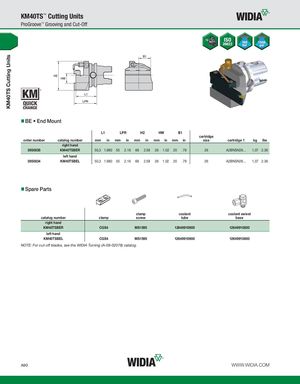 KM40TS Cutting Units KM40TS™ Cutting Units ProGroove™ Grooving and Cut-Off BE • End Mount L1 LPR H2 HW B1 cartridge order number catalog number mm in mm in mm in mm in mm in size cartridge 1 kg lbs right hand 3950835 KM40TSBER 50,3 1.980 55 2.16 66 2.58 26 1.02 20 .79 26 A2BNSN26... 1,07 2.36 left hand 3950834 KM40TSBEL 50,3 1.980 55 2.16 66 2.58 26 1.02 20 .79 26 A2BNSN26... 1,07 2.36 Spare Parts clamp coolant coolant swivel catalog number clamp screw tube base right hand KM40TSBER CGS4 MS1595 12649910900 12649910800 left hand KM40TSBEL CGS4 MS1595 12649910900 12649910800 NOTE: For cut-off blades, see the WIDIA Turning (A-09-02078) catalog. A90 WWW.WIDIA.COM