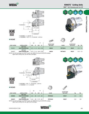 KM40TS Cutting Units KM40TS™ Cutting Units WMT™ SLS Grooving and Cut-Off F ASSEMBLY L1 BLADE FS BLADE L1 ASSEMBLY F ASSEMBLY = L1 BLADE - F L1 ASSEMBLY = W/2 + L1 + FS BLADE - 0,787mm WGME L1 F button-head socket-head order number catalog number mm in mm in cap screw nozzle cap screw kg lbs right hand 3949874 KM40TSWGMER55M 53,79 2.118 -9,98 -0.393 606256 PMT08430 MS337 0,56 1.24 left hand 3949875 KM40TSWGMEL55M 53,79 2.118 -9,98 -0.393 606256 PMT08430 MS337 0,56 1.24 NOTE: For SLS cartridges and WMT inserts, see WIDIA Turning (A-09-02078) catalog. Right-hand cutting units use left-hand cartridges. F ASSEMBLY FS BLADE L1 BLADE L1 ASSEMBLY F ASSEMBLY = W/2 + F + FS BLADE - 0,787mm L1 ASSEMBLY = L1 + L1 BLADE WGMS L1 F socket-head order number catalog number mm in mm in nozzle cap screw kg lbs right hand 3949802 KM40TSWGMSR55M 24,52 .965 15,79 .622 PMT08430 MS337 0,49 1.08 left hand 3949873 KM40TSWGMSL55M 24,52 .965 15,79 .622 PMT08430 MS337 0,49 1.08 NOTE: For SLS cartridges and WMT inserts, see WIDIA Turning (A-09-02078) catalog. Right-hand cutting units use right-hand cartridges. WWW.WIDIA.COM A91