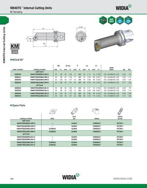 KM40TS Internal Cutting Units KM40TS™ Internal Cutting Units M-Clamping MCLN 95° D2 D min F L4 L1 gage order number catalog number mm in mm in mm in mm in mm in insert kg lbs right hand 3955549 KM40TSS25EMCLNR12 25 .98 32 1.26 17 .669 55 2.17 70 2.756 CN..120408/CN..432 0,35 .76 3955551 KM40TSS25HMCLNR12 25 .98 32 1.26 17 .669 75 2.95 100 3.937 CN..120408/CN..432 0,50 1.10 3955553 KM40TSS32GMCLNR12 32 1.26 40 1.57 22 .866 76 2.99 90 3.543 CN..120408/CN..432 0,59 1.29 3955555 KM40TSS32JMCLNR12 32 1.26 40 1.57 22 .866 96 3.78 110 4.331 CN..120408/CN..432 0,71 1.56 left hand 3955548 KM40TSS25EMCLNL12 25 .98 32 1.26 17 .669 55 2.17 70 2.756 CN..120408/CN..432 0,35 .76 3955550 KM40TSS25HMCLNL12 25 .98 32 1.26 17 .669 75 2.95 100 3.937 CN..120408/CN..432 0,50 1.10 3955552 KM40TSS32GMCLNL12 32 1.26 40 1.57 22 .866 76 2.99 90 3.543 CN..120408/CN..432 0,59 1.29 3955554 KM40TSS32JMCLNL12 32 1.26 40 1.57 22 .866 96 3.78 110 4.331 CN..120408/CN..432 0,71 1.56 Spare Parts lock clamp catalog number shim pin clamp screw right hand KM40TSS25EMCLNR12 — KLM43 CKM20LP STCM11 KM40TSS25HMCLNR12 — KLM43 CKM20LP STCM11 KM40TSS32GMCLNR12 ICSN432 KLM46 CKM20LP STCM11 KM40TSS32JMCLNR12 ICSN432 KLM46 CKM20LP STCM11 left hand KM40TSS25EMCLNL12 — KLM43 CKM20LP STCM11 KM40TSS25HMCLNL12 — KLM43 CKM20LP STCM11 KM40TSS32GMCLNL12 ICSN432 KLM46 CKM20LP STCM11 KM40TSS32JMCLNL12 ICSN432 KLM46 CKM20LP STCM11 A92 WWW.WIDIA.COM