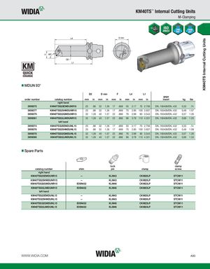 KM40TS Internal Cutting Units KM40TS™ Internal Cutting Units M-Clamping MDUN 93° D2 D min F L4 L1 gage order number catalog number mm in mm in mm in mm in mm in insert kg lbs right hand 3959375 KM40TSS25EMDUNR15 25 .98 32 1.26 17 .669 55 2.17 70 2.756 DN..150408/DN..432 0,33 .74 3959377 KM40TSS25HMDUNR15 25 .98 32 1.26 17 .669 75 2.95 100 3.937 DN..150408/DN..432 0,49 1.07 3959379 KM40TSS32GMDUNR15 32 1.26 40 1.57 22 .866 76 2.99 90 3.543 DN..150408/DN..432 0,57 1.26 3959381 KM40TSS32JMDUNR15 32 1.26 40 1.57 22 .866 96 3.78 110 4.331 DN..150408/DN..432 0,69 1.53 left hand 3959374 KM40TSS25EMDUNL15 25 .98 32 1.26 17 .669 55 2.17 70 2.756 DN..150408/DN..432 0,33 .74 3959376 KM40TSS25HMDUNL15 25 .98 32 1.26 17 .669 75 2.95 100 3.937 DN..150408/DN..432 0,49 1.08 3959378 KM40TSS32GMDUNL15 32 1.26 40 1.57 22 .866 76 2.99 90 3.543 DN..150408/DN..432 0,57 1.26 3959380 KM40TSS32JMDUNL15 32 1.26 40 1.57 22 .866 96 3.78 110 4.331 DN..150408/DN..432 0,69 1.53 Spare Parts lock clamp catalog number shim pin clamp screw right hand KM40TSS25EMDUNR15 — KLM43 CKM20LP STCM11 KM40TSS25HMDUNR15 — KLM43 CKM20LP STCM11 KM40TSS32GMDUNR15 IDSN432 KLM46 CKM23LP STCM11 KM40TSS32JMDUNR15 IDSN432 KLM46 CKM23LP STCM11 left hand KM40TSS25EMDUNL15 — KLM43 CKM20LP STCM11 KM40TSS25HMDUNL15 — KLM43 CKM20LP STCM11 KM40TSS32GMDUNL15 IDSN432 KLM46 CKM23LP STCM11 KM40TSS32JMDUNL15 IDSN432 KLM46 CKM23LP STCM11 WWW.WIDIA.COM A93