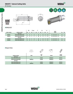 KM40TS Internal Cutting Units KM40TS™ Internal Cutting Units M-Clamping MWLN 95° D2 D min F L4 L1 gage order number catalog number mm in mm in mm in mm in mm in insert kg lbs right hand 3959331 KM40TSS25HMWLNR08 25 .98 32 1.26 17 .669 75 2.95 100 3.937 WN..080408/WN..432 0,50 1.10 3959373 KM40TSS32JMWLNR08 32 1.26 40 1.57 22 .866 96 3.78 110 4.331 WN..080408/WN..432 0,69 1.53 left hand 3959330 KM40TSS25HMWLNL08 25 .98 32 1.26 17 .669 75 2.95 100 3.937 WN..080408/WN..432 0,50 1.10 3959332 KM40TSS32JMWLNL08 32 1.26 40 1.57 22 .866 96 3.78 110 4.331 WN..080408/WN..432 0,69 1.53 Spare Parts lock clamp catalog number shim pin clamp screw right hand KM40TSS25HMWLNR08 — KLM43 CKM20LP STCM11 KM40TSS32JMWLNR08 IWSN433 KLM46 CKM20LP STCM11 left hand KM40TSS25HMWLNL08 — KLM43 CKM20LP STCM11 KM40TSS32JMWLNL08 IWSN433 KLM46 CKM20LP STCM11 A94 WWW.WIDIA.COM