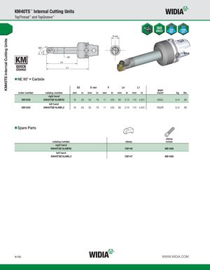 KM40TS Internal Cutting Units KM40TS™ Internal Cutting Units TopThread™ and TopGroove™ NE 90° • Carbide D2 D min F L4 L1 gage order number catalog number mm in mm in mm in mm in mm in insert kg lbs right hand 3951836 KM40TSE16JNER2 16 .63 20 .79 11 .433 80 3.15 110 4.331 NG2L 0,41 .90 left hand 3951835 KM40TSE16JNEL2 16 .63 20 .79 11 .433 80 3.15 110 4.331 NG2R 0,41 .90 Spare Parts clamp catalog number clamp screw right hand KM40TSE16JNER2 CM146 MS1488 left hand KM40TSE16JNEL2 CM147 MS1488 A100 WWW.WIDIA.COM