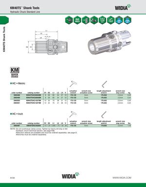 KM40TS Shank Tools KM40TS™ Shank Tools Hydraulic Chuck Standard Line HC • Metric actuation wrench size length adjustment wrench size order number catalog number D1 D2 L1 L2 L9 V wrench actuation screw wrench stop screw kg 3960498 KM40TSHC06065M 6 26 65 34 27 10 170.135 5mm 170.002 2,5mm 0,43 3960499 KM40TSHC08065M 8 28 65 34 27 10 170.135 5mm 170.002 2,5mm 0,44 3960500 KM40TSHC10070M 10 30 70 38 31 10 170.135 5mm 170.002 2,5mm 0,49 3960501 KM40TSHC12075M 12 32 75 41 36 10 170.135 5mm 170.002 2,5mm 0,53 HC • Inch actuation wrench size length adjustment wrench size order number catalog number D1 D2 L1 L2 L9 V wrench actuation screw wrench stop screw lbs 3960497 KM40TSHC050300 1/2 1.24 3.000 1.75 1.42 .39 170.135 5mm 170.002 2,5mm 1.16 NOTE: Do not overtorque clamp screw. Tighten by hand until stop is felt. Hydraulic chuck technical section, see page K60. Reduction sleeves are available and must be ordered separately; see page I2. Wrenches must be ordered separately. A104 WWW.WIDIA.COM