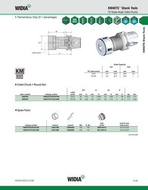 KM40TS Shank Tools KM40TS™ Shank Tools TG Single-Angle Collet Chucks • Tremendous Grip (3:1 advantage). collet series Collet Capacity mm inch TG collet series min max min max TG75 2,6 20,0 3/64 3/4 TG100 2,6 25,5 5/64 1 Collet Chuck • Round Nut D11 L1 L9 V collet order number catalog number series mm in mm in mm in mm in kg lbs 3969764 KM40TSTG075075M TG75 50 1.97 75 2.953 53 2.09 2 .08 0,64 1.41 3969765 KM40TSTG100100M TG100 60 2.36 100 3.937 69 2.72 5 .20 1,17 2.58 Spare Parts stop wrench size catalog number locknut wrench Nm ft. lbs. screw stop screw KM40TSTG075075M LNA075M HSW45M 136 100 SS081041G 4mm & 5/32 KM40TSTG100100M LNA100M HSW58M 203 150 SS112041G 4mm & 5/32 (continued) WWW.WIDIA.COM A105
