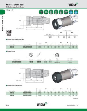KM40TS Shank Tools KM40TS™ Shank Tools DA Double-Angle Collet Chucks • Grip 1:1. collet series Collet Capacity mm inch DA collet series min max min max 200DA 0,2 10,0 1/64 25/64 180DA 2,2 20,0 1/64 3/4 Collet Chuck • Round Nut D11 L1 L9 V collet order number catalog number series mm in mm in mm in mm in kg lbs 3950189 KM40TSDA188065M DA180 43 1.69 65 2.559 49,0 1.93 — — 0,48 1.05 3950190 KM40TSDA188080M DA180 43 1.69 80 3.150 49,0 1.93 5 .20 0,58 1.28 Spare Parts stop wrench size catalog number locknut wrench Nm ft. lbs. screw stop screw KM40TSDA188065M LNA188M HSW45M 80-100 60-75 — — KM40TSDA188080M LNA188M HSW45M 80-100 60-75 SS081041G M4 & 5/32 collet series Collet Chuck • Hex Nut D11 L1 L9 V collet order number catalog number series mm in mm in mm in mm in kg lbs 3950191 KM40TSDA208236 DA200 29 1.15 60 2.362 35,0 1.38 8 .32 0,28 .61 3950187 KM40TSDA188256 DA180 44 1.73 65 2.559 49,0 1.93 — — 0,39 .85 3950188 KM40TSDA188315 DA180 44 1.73 80 3.150 49,0 1.93 5 .20 0,49 1.09 (continued) A108 WWW.WIDIA.COM