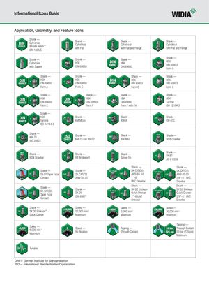 Informational Icons Guide Application, Geometry, and Feature Icons Shank —CylindricalWhistle Notch™DIN 1835/E Shank —Cylindricalwith Flat Shank — Shank —CylindricalCylindricalwith Flat and Flangewith Flat and Flange Shank —Cylindricalwith Square Shank —HSKDIN 69893 Shank —HSKDIN 69893 Shank —HSKDIN 69893Form A Shank — Shank — Shank — Shank — HSK HSKDIN 69893CDIN 69893 HSK E HSKDIN 69893DIN 69893 Form A Form C Form C Form E Shank — Shank — Shank — Shank — HSK HSK HSK HSK DIN 69893 DIN 69893 DIN 69893 Turning Form E Form F Form F with Pin ISO 12164-3 Shank — HSK Shank — Shank — Shank — Turning KM Micro KM4X KM-ATC ISO 12164-3 Shank —KM-TSISO 26622 Shank — Shank —KM-TS ISO 26622KM-XMZ Shank —M16 Drawbar Shank — Shank — Shank —M24 DrawbarR8 BridgeportScrew-On Shank —SK BTJIS B 6339 Shank — Shank — Shank — Shank — SK CAT(CV) SK CAT(CV) SK BT Taper Face SK CAT(CV) ANSI B5.50 ANSI B5.50 Contact ANSI B5.50 1"–8 5/8"–11 UNC UNC Drawbar Drawbar Shank —SK CAT(CV)Taper FaceContact Shank —SK DVDIN 69871 Shank — Shank —SK QC EricksonSK QC EricksonQuick ChangeQuick Change1"–8 UNC5/8"–11 UNCDrawbarDrawbar Shank — Speed — Speed — Speed — SK QC Erickson™ 20,000 min-1 3,000 min-1 30,000 min-1 Quick Change Maximum Maximum Maximum Tapping — Speed — Speed — Tapping — Through Coolant 6,000 min-1 No Rotation Through Coolant 50 bar (725 psi) Maximum Maximum Tunable DIN — German Institute for Standardization ISO — International Standardization Organization
