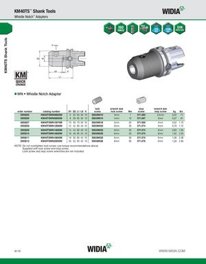 KM40TS Shank Tools KM40TS™ Shank Tools Whistle Notch™ Adapters WN • Whistle Notch Adapter lock wrench size stop wrench size order number catalog number D1 D2 L1 L9 V screw lock screw Nm screw stop screw kg lbs 3950205 KM40TSWN06065M 6 25 65 30 10 SS03M012 3mm 7 571.060 2,5mm 0,32 .71 3950206 KM40TSWN08065M 8 28 65 30 10 SS03M014 4mm 15 571.067 3mm 0,37 .81 3950207 KM40TSWN10070M 10 35 70 35 10 SS03M018 5mm 25 571.068 4mm 0,52 1.15 3950208 KM40TSWN12080M 12 42 80 40 10 SS03M023 6mm 35 571.074 5mm 0,78 1.72 3950209 KM40TSWN14080M 14 44 80 40 10 SS03M023 6mm 35 571.074 5mm 0,83 1.84 3950210 KM40TSWN16085M 16 48 85 43 10 SS03M025 6mm 50 571.075 6mm 1,02 2.25 3950211 KM40TSWN18085M 18 50 85 43 10 SS03M025 6mm 50 571.075 6mm 1,08 2.38 3950212 KM40TSWN20095M 20 52 95 45 10 SS03M026 8mm 95 571.076 6mm 1,28 2.83 NOTE: Do not overtighten lock screw; use torque recommendations above. Supplied with lock screw and stop screw. Lock screw and stop screw wrenches are not included. A110 WWW.WIDIA.COM