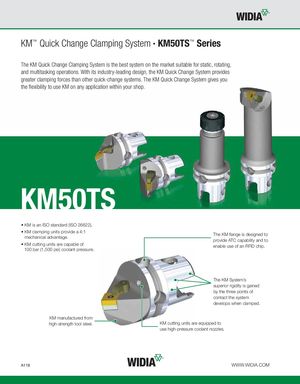 KM™ Quick Change Clamping System • KM50TS™ Series The KM Quick Change Clamping System is the best system on the market suitable for static, rotating, and multitasking operations. With its industry-leading design, the KM Quick Change System provides greater clamping forces than other quick-change systems. The KM Quick Change System gives you the flexibility to use KM on any application within your shop. KM50TS • KM is an ISO standard (ISO 26622). • KM clamping units provide a 4:1mechanical advantage. The KM flange is designed to provide ATC capability and to • KM cutting units are capable of enable use of an RFID chip. 100 bar (1,500 psi) coolant pressure. The KM System’s superior rigidity is gained by the three points of contact the system develops when clamped. KM manufactured from high-strength tool steel. KM cutting units are equipped to use high-pressure coolant nozzles. A118 WWW.WIDIA.COM