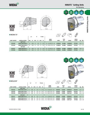 KM50TS Cutting Units KM50TS™ Cutting Units M-Clamping MCKN 75° L1 F D min gage lock clamp order number catalog number mm in mm in mm in insert shim pin clamp screw kg lbs right hand 3738139 KM50TSMCKNR12 50 1.969 35 1.378 70 2.756 CN..120408/CN..432 ICSN432 KLM46 CKM20LP STCM11 0,68 1.51 3738140 KM50TSMCKNR16 50 1.969 35 1.378 70 2.756 CN..160612/CN..543 ICSN533 KLM58 CKM20LP STCM11 0,71 1.57 left hand 3738137 KM50TSMCKNL12 50 1.969 35 1.378 70 2.756 CN..120408/CN..432 ICSN432 KLM46 CKM20LP STCM11 0,68 1.51 3738138 KM50TSMCKNL16 50 1.969 35 1.378 70 2.756 CN..160612/CN..543 ICSN533 KLM58 CKM20LP STCM11 0,71 1.57 MCLN 95° L1 F D min gage lock clamp order number catalog number mm in mm in mm in insert shim pin clamp screw kg lbs right hand 3738164 KM50TSMCLNR12 50 1.969 35 1.378 70 2.756 CN..120408/CN..432 ICSN432 KLM46 CKM20LP STCM11 0,64 1.42 3738165 KM50TSMCLNR16 50 1.969 35 1.378 90 3.543 CN..160612/CN..543 ICSN533 KLM58 CKM20LP STCM11 0,64 1.41 3738166 KM50TSMCLNR19 50 1.969 35 1.378 90 3.543 CN..190612/CN..643 ICSN633 KLM68 CKM13LP STCM8 0,63 1.39 left hand 3738141 KM50TSMCLNL12 50 1.969 35 1.378 70 2.756 CN..120408/CN..432 ICSN432 KLM46 CKM20LP STCM11 0,64 1.41 3738142 KM50TSMCLNL16 50 1.969 35 1.378 90 3.543 CN..160612/CN..543 ICSN533 KLM58 CKM20LP STCM11 0,64 1.41 3738163 KM50TSMCLNL19 50 1.969 35 1.378 90 3.543 CN..190612/CN..643 ICSN633 KLM68 CKM13LP STCM8 0,63 1.39 WWW.WIDIA.COM A119