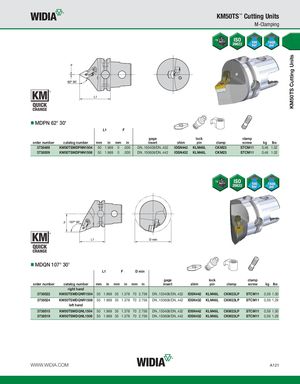 KM50TS Cutting Units KM50TS™ Cutting Units M-Clamping MDPN 62° 30' L1 F gage lock clamp order number catalog number mm in mm in insert shim pin clamp screw kg lbs 3738489 KM50TSMDPNN1504 50 1.969 0 .000 DN..150408/DN..432 IDSN442 KLM46L CKM23 STCM11 0,46 1.02 3738509 KM50TSMDPNN1506 50 1.969 0 .000 DN..150608/DN..442 IDSN432 KLM46L CKM23 STCM11 0,46 1.02 MDQN 107° 30' L1 F D min gage lock clamp order number catalog number mm in mm in mm in insert shim pin clamp screw kg lbs right hand 3738522 KM50TSMDQNR1504 50 1.969 35 1.378 70 2.756 DN..150408/DN..432 IDSN442 KLM46L CKM23LP STCM11 0,59 1.30 3738524 KM50TSMDQNR1506 50 1.969 35 1.378 70 2.756 DN..150608/DN..442 IDSN432 KLM46L CKM23LP STCM11 0,59 1.29 left hand 3738515 KM50TSMDQNL1504 50 1.969 35 1.378 70 2.756 DN..150408/DN..432 IDSN442 KLM46L CKM23LP STCM11 0,59 1.30 3738519 KM50TSMDQNL1506 50 1.969 35 1.378 70 2.756 DN..150608/DN..442 IDSN432 KLM46L CKM23LP STCM11 0,59 1.29 WWW.WIDIA.COM A121