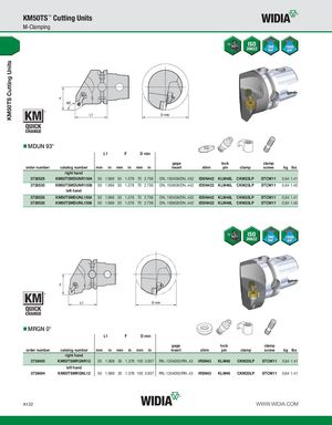 KM50TS Cutting Units KM50TS™ Cutting Units M-Clamping MDUN 93° L1 F D min gage lock clamp order number catalog number mm in mm in mm in insert shim pin clamp screw kg lbs right hand 3738529 KM50TSMDUNR1504 50 1.969 35 1.378 70 2.756 DN..150408/DN..432 IDSN442 KLM46L CKM23LP STCM11 0,64 1.41 3738530 KM50TSMDUNR1506 50 1.969 35 1.378 70 2.756 DN..150608/DN..442 IDSN432 KLM46L CKM23LP STCM11 0,64 1.40 left hand 3738526 KM50TSMDUNL1504 50 1.969 35 1.378 70 2.756 DN..150408/DN..432 IDSN442 KLM46L CKM23LP STCM11 0,64 1.41 3738528 KM50TSMDUNL1506 50 1.969 35 1.378 70 2.756 DN..150608/DN..442 IDSN432 KLM46L CKM23LP STCM11 0,64 1.40 MRGN 0° L1 F D min gage lock clamp order number catalog number mm in mm in mm in insert shim pin clamp screw kg lbs right hand 3738485 KM50TSMRGNR12 50 1.969 35 1.378 100 3.937 RN..1204000/RN..43 IRSN43 KLM46 CKM20LP STCM11 0,64 1.41 left hand 3738484 KM50TSMRGNL12 50 1.969 35 1.378 100 3.937 RN..1204000/RN..43 IRSN43 KLM46 CKM20LP STCM11 0,64 1.41 A122 WWW.WIDIA.COM