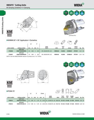 KM50TS Cutting Units KM50TS™ Cutting Units M-Clamping Centerline • P-Clamping Left-Hand Tool MWMN 50° • 95° Application • Centerline L1 F gage lock clamp order number catalog number mm in mm in insert shim pin clamp screw kg lbs right hand 3738598 KM50TSMWMNR08 50 1.969 0 .000 WN..080408/WN..432 IWSN433 KLM46 CKM20LP STCM11 0,49 1.08 left hand 3738597 KM50TSMWMNL08 50 1.969 0 .000 WN..080408/WN..432 IWSN433 KLM46 CKM20LP STCM11 0,49 1.08 NOTE: Use the KM63TSS5065 reducer to produce an L1 of 115mm. PCKN 75° L1 F D min gage lever shim toggle order number catalog number mm in mm in mm in insert shim screw pin lever punch kg lbs right hand 3738514 KM50TSPCKNR12 50 1.969 35 1.378 63 2.480 CN..120408/CN..432 512.112 514.123 513.023 511.023 515.018 0,68 1.50 left hand 3738513 KM50TSPCKNL12 50 1.969 35 1.378 63 2.480 CN..120408/CN..432 512.112 514.123 513.023 511.023 515.018 0,68 1.50 A130 WWW.WIDIA.COM