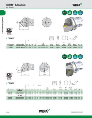 KM50TS Cutting Units KM50TS™ Cutting Units P-Clamping PSDN 45° L1 F gage lever shim toggle order number catalog number mm in mm in insert shim screw pin lever punch kg lbs 3752980 KM50TSPSDNN12 50 1.969 0 .000 SN..120408/SN..432 512.063 514.123 513.023 511.023 515.018 0,50 1.09 3752981 KM50TSPSDNN15 50 1.969 0 .000 SN..150612/SN..543 512.025 514.125 513.025 511.025 515.022 0,50 1.08 PSKN 75° L1 F D min gage lever shim toggle order number catalog number mm in mm in mm in insert shim screw pin lever punch kg lbs right hand 3753153 KM50TSPSKNR12 50 1.969 35 1.378 63 2.480 SN..120408/SN..432 512.063 514.123 513.023 511.023 515.018 0,69 1.52 3753155 KM50TSPSKNR15 50 1.969 35 1.378 63 2.480 SN..150612/SN..543 512.025 514.125 513.025 511.025 515.022 0,69 1.53 left hand 3752982 KM50TSPSKNL12 50 1.969 35 1.378 63 2.480 SN..120408/SN..432 512.063 514.123 513.023 511.023 515.018 0,69 1.52 3753154 KM50TSPSKNL15 50 1.969 35 1.378 63 2.480 SN..150612/SN..543 512.025 514.125 513.025 511.025 515.022 0,69 1.53 A134 WWW.WIDIA.COM