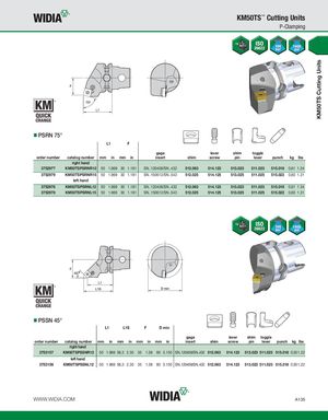KM50TS Cutting Units KM50TS™ Cutting Units P-Clamping PSRN 75° L1 F gage lever shim toggle order number catalog number mm in mm in insert shim screw pin lever punch kg lbs right hand 3752977 KM50TSPSRNR12 50 1.969 30 1.181 SN..120408/SN..432 512.063 514.123 513.023 511.023 515.018 0,61 1.34 3752979 KM50TSPSRNR15 50 1.969 30 1.181 SN..150612/SN..543 512.025 514.125 513.025 511.025 515.022 0,60 1.31 left hand 3752976 KM50TSPSRNL12 50 1.969 30 1.181 SN..120408/SN..432 512.063 514.123 513.023 511.023 515.018 0,61 1.34 3752978 KM50TSPSRNL15 50 1.969 30 1.181 SN..150612/SN..543 512.025 514.125 513.025 511.025 515.022 0,60 1.31 PSSN 45° L1 L1S F D min gage lever shim toggle order number catalog number mm in mm in mm in mm in insert shim screw pin lever punch kg lbs right hand 3753157 KM50TSPSSNR12 50 1.969 58,3 2.30 35 1.38 80 3.150 SN..120408/SN..432 512.063 514.123 513.023 511.023 515.018 0,55 1.22 left hand 3753156 KM50TSPSSNL12 50 1.969 58,3 2.30 35 1.38 80 3.150 SN..120408/SN..432 512.063 514.123 513.023 511.023 515.018 0,55 1.22 WWW.WIDIA.COM A135