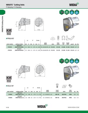 KM50TS Cutting Units KM50TS™ Cutting Units P-Clamping • S-Clamping PWLN 95° L1 F D min gage lever shim toggle order number catalog number mm in mm in mm in insert shim screw pin lever punch kg lbs right hand 3753159 KM50TSPWLNR08 50 1.969 35 1.378 63 2.480 WN..080408/WN..432 512.135 514.123 513.023 511.023 515.018 0,67 1.48 left hand 3753158 KM50TSPWLNL08 50 1.969 35 1.378 63 2.480 WN..080408/WN..432 512.135 514.123 513.023 511.023 515.018 0,67 1.48 SCLC 95° L1 F D min gage insert shim order number catalog number mm in mm in mm in insert screw shim screw kg lbs right hand 3746594 KM50TSSCLCR12 50 1.969 35 1.378 70 2.756 CC..120408/CC..432 MS1158 SKCP453 SRS4 0,64 1.40 left hand 3746593 KM50TSSCLCL12 50 1.969 35 1.378 70 2.756 CC..120408/CC..432 MS1158 SKCP453 SRS4 0,64 1.40 A136 WWW.WIDIA.COM
