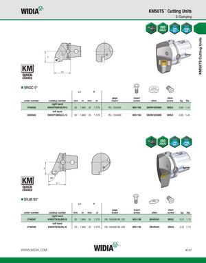KM50TS Cutting Units KM50TS™ Cutting Units S-Clamping F SRGC 0° L1 F gage insert shim order number catalog number mm in mm in insert screw shim screw kg lbs right hand 3746595 KM50TSSRGCR12 50 1.969 35 1.378 RC..1204M0 MS1156 SKRN1203M0 SRS3 0,65 1.43 left hand 3838582 KM50TSSRGCL12 50 1.969 35 1.378 RC..1204M0 MS1156 SKRN1203M0 SRS3 0,65 1.43 SVJB 93° L1 F gage insert shim order number catalog number mm in mm in insert screw shim screw kg lbs right hand 3746597 KM50TSSVJBR16 50 1.969 35 1.378 VB..160408/VB..332 MS1156 SKVN343 SRS3 0,51 1.13 left hand 3746596 KM50TSSVJBL16 50 1.969 35 1.378 VB..160408/VB..332 MS1156 SKVN343 SRS3 0,51 1.13 WWW.WIDIA.COM A137