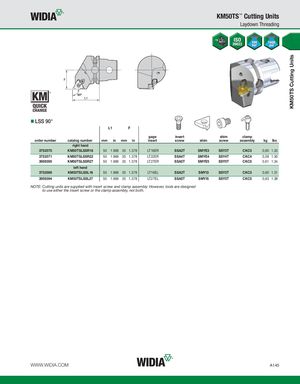 KM50TS Cutting Units KM50TS™ Cutting Units Laydown Threading LSS 90° L1 F gage insert shim clamp order number catalog number mm in mm in insert screw shim screw assembly kg lbs right hand 3753570 KM50TSLSSR16 50 1.969 35 1.378 LT16ER SSA3T SMYE3 SSY3T CKC3 0,60 1.33 3753571 KM50TSLSSR22 50 1.969 35 1.378 LT22ER SSA4T SMYE4 SSY4T CKC4 0,59 1.30 3959395 KM50TSLSSR27 50 1.969 35 1.378 LT27ER SSA5T SMYE5 SSY5T CKC5 0,61 1.34 left hand 3753569 KM50TSLSSL16 50 1.969 35 1.378 LT16EL SSA3T SMYI3 SSY3T CKC3 0,60 1.31 3959394 KM50TSLSSL27 50 1.969 35 1.378 LT27EL SSA5T SMYI5 SSY5T CKC5 0,63 1.38 NOTE: Cutting units are supplied with insert screw and clamp assembly. However, tools are designed to use either the insert screw or the clamp assembly, not both. WWW.WIDIA.COM A145