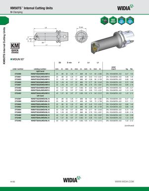 KM50TS Internal Cutting Units KM50TS™ Internal Cutting Units M-Clamping MDUN 93° D2 D min F L4 L1 gage order number catalog number mm in mm in mm in mm in mm in insert kg lbs right hand 3753598 KM50TSS25DMDUNR15 25 .98 32 1.26 17 .669 38 1.51 60 2.362 DN..150408/DN..432 0,47 1.03 3753601 KM50TSS25JMDUNR15 25 .98 32 1.26 17 .669 87 3.43 110 4.331 DN..150408/DN..432 0,66 1.46 3753603 KM50TSS32FMDUNR15 32 1.26 40 1.57 22 .866 60 2.38 80 3.150 DN..150408/DN..432 0,66 1.46 3753605 KM50TSS32GMDUNR15 32 1.26 40 1.57 22 .866 70 2.77 90 3.543 DN..150408/DN..432 0,72 1.59 3753607 KM50TSS32KMDUNR15 32 1.26 40 1.57 22 .866 96 3.79 125 4.921 DN..150408/DN..432 0,99 2.18 3753485 KM50TSS40HMDUNR15 40 1.57 50 1.97 27 1.063 81 3.20 100 3.937 DN..150408/DN..432 1,03 2.27 3753490 KM50TSS40JMDUNR15 40 1.57 50 1.97 27 1.063 91 3.59 110 4.331 DN..150408/DN..432 1,13 2.49 3753493 KM50TSS40LMDUNR15 40 1.57 50 1.97 27 1.063 120 4.74 140 5.512 DN..150408/DN..432 1,42 3.12 left hand 3753597 KM50TSS25DMDUNL15 25 .98 32 1.26 17 .669 38 1.51 60 2.362 DN..150408/DN..432 0,47 1.03 3753599 KM50TSS25EMDUNL15 25 .98 32 1.26 17 .669 48 1.90 70 2.756 DN..150408/DN..432 0,51 1.11 3753600 KM50TSS25JMDUNL15 25 .98 32 1.26 17 .669 87 3.43 110 4.331 DN..150408/DN..432 0,66 1.45 3753602 KM50TSS32FMDUNL15 32 1.26 40 1.57 22 .866 60 2.38 80 3.150 DN..150408/DN..432 0,66 1.46 3753604 KM50TSS32GMDUNL15 32 1.26 40 1.57 22 .866 70 2.77 90 3.543 DN..150408/DN..432 0,72 1.59 3753606 KM50TSS32KMDUNL15 32 1.26 40 1.57 22 .866 96 3.79 125 4.921 DN..150408/DN..432 0,99 2.18 3753480 KM50TSS40HMDUNL15 40 1.57 50 1.97 27 1.063 81 3.20 100 3.937 DN..150408/DN..432 1,03 2.28 3753488 KM50TSS40JMDUNL15 40 1.57 50 1.97 27 1.063 91 3.59 110 4.331 DN..150408/DN..432 1,13 2.49 3753492 KM50TSS40LMDUNL15 40 1.57 50 1.97 27 1.063 120 4.74 140 5.512 DN..150408/DN..432 1,42 3.12 (continued) A150 WWW.WIDIA.COM